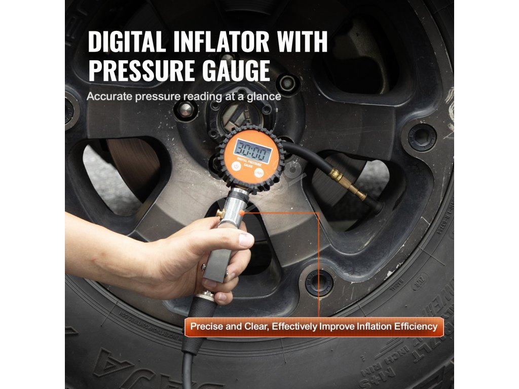 Díky digitálnímu huštění pneumatik s manometrem můžete jednoduše podržet spoušť huštění, abyste zahájili huštění, a uvolnit ji, abyste ho zastavili. To umožňuje efektivní huštění a sledování tlaku v reálném čase bez nutnosti opakovaně zapínat/vypínat spínač vzduchového kompresoru.