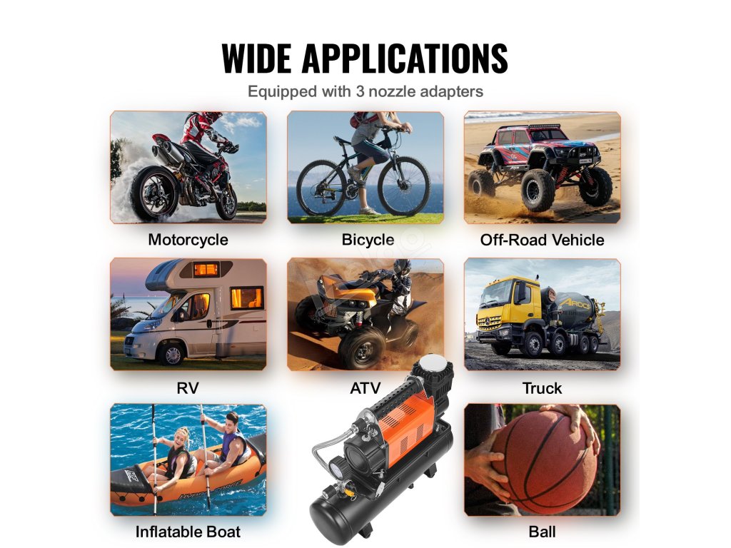 Tato přenosná 12voltová hustilka pneumatik vybavená 3 adaptéry s tryskami je univerzální pro různá vozidla včetně osobních automobilů, SUV, nákladních automobilů, dodávek a obytných vozů. Je také určena pro motocykly, jízdní kola, míče a další rekreační zařízení, jako jsou nafukovací hračky a čluny.