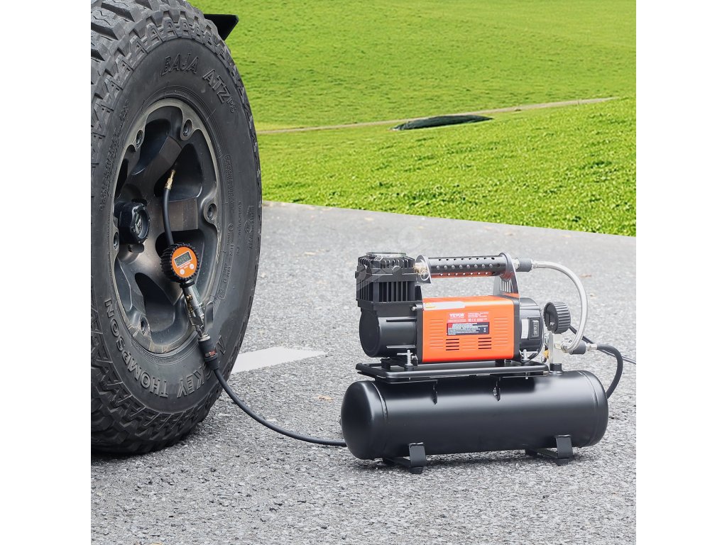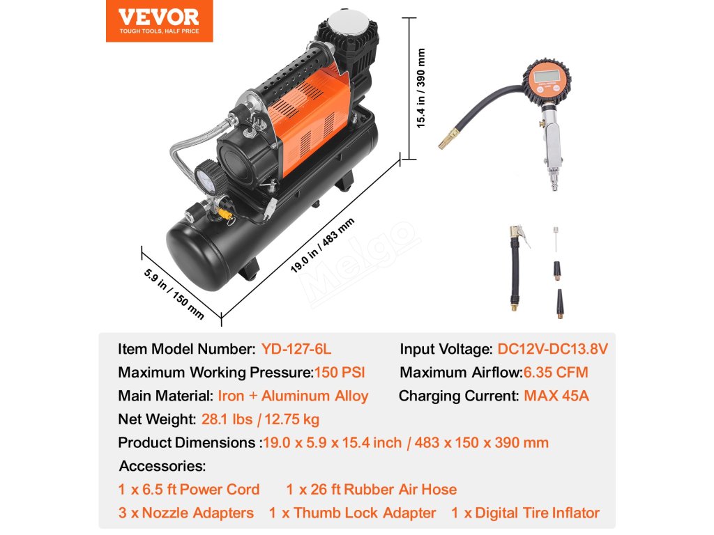 Buďte připraveni s přenosným 12V kompresorem VEVOR pro vysoké zatížení s 6l nádrží a digitálním nafukovacím zařízením - spolehlivým společníkem pro bezproblémové nafouknutí kdykoli a kdekoli. S maximálním tlakem 150 PSI a vysokým průtokem vzduchu 6,35 CFM vás tento hukovač pneumatik v mžiku vrátí zpět na silnici.