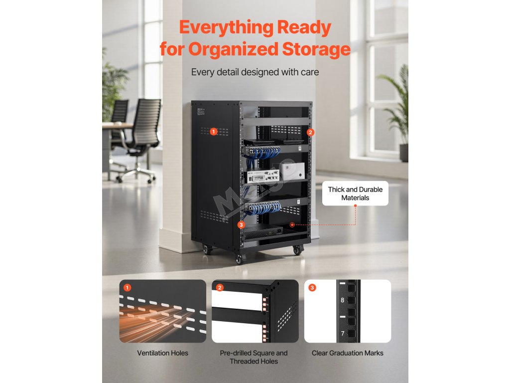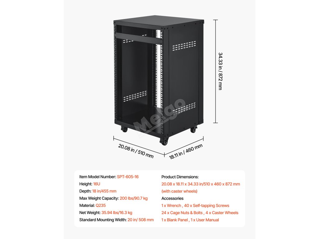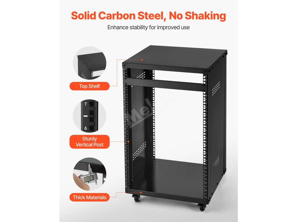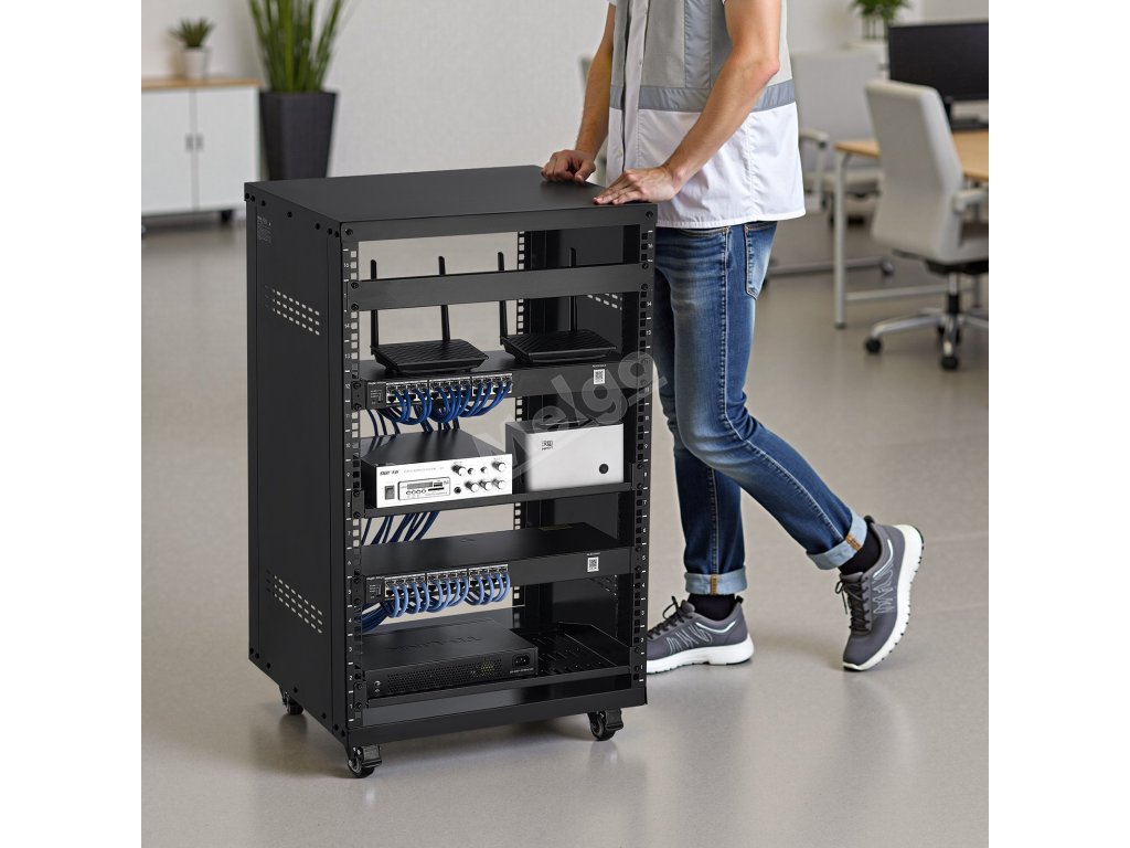 16U otevřený rack, 90.7 kg nosnost, uzamykatelná kolečka, pro av/it