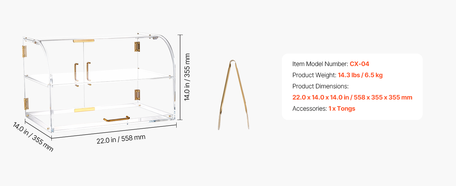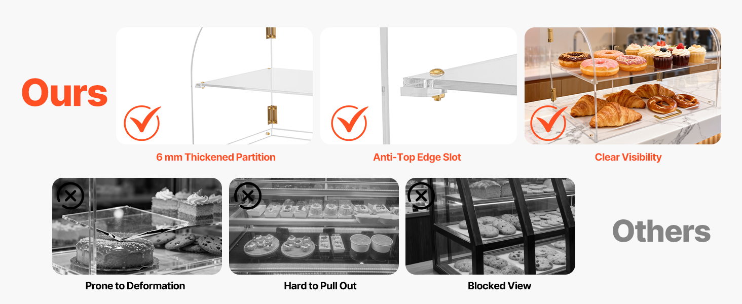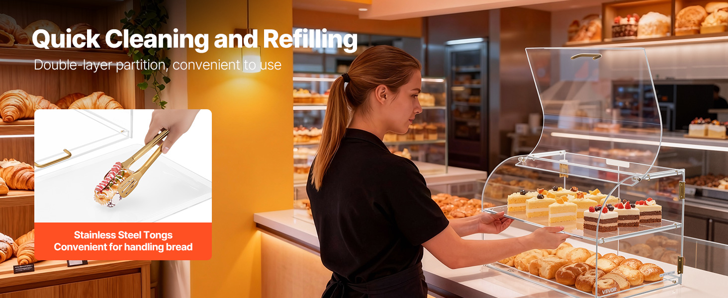 Tato akrylátová vitrína na pečivo je navržena tak, aby krásně prezentovala pekařské výrobky na regálech a poskytovala jasný a plný pohled, který přitahuje zákazníky. Lehká, ale pevná konstrukce z čirého akrylu zvýrazní vaše pečivo a zároveň zajistí stabilitu, odolnost a snadné přenášení.