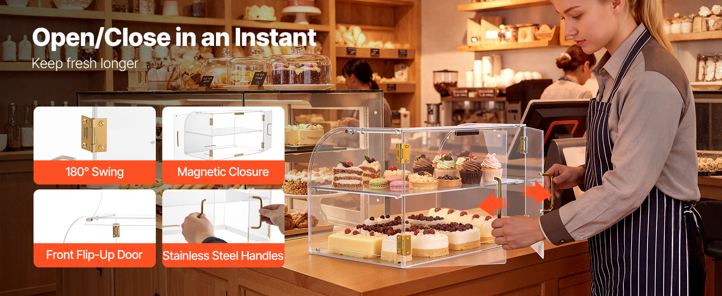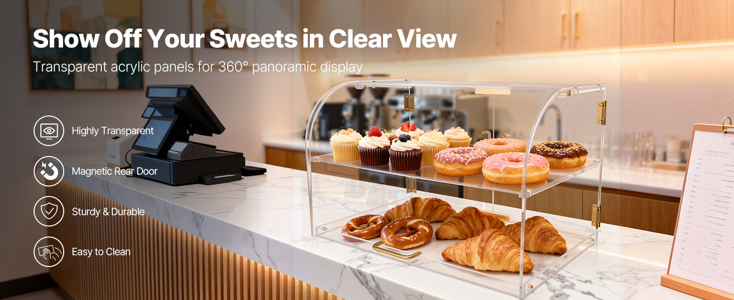Tato vitrína na zákusky je vybavena zesílenou policí, která zajišťuje větší pevnost a odolnost. Je vyrobena z vysoce kvalitního, vysoce průhledného akrylu a poskytuje křišťálově čistý 360° pohled na vaše pečivo. Vylepšený systém dvířek zajišťuje pohodlné doplňování a snadné čištění při zachování bezchybného vzhledu.
