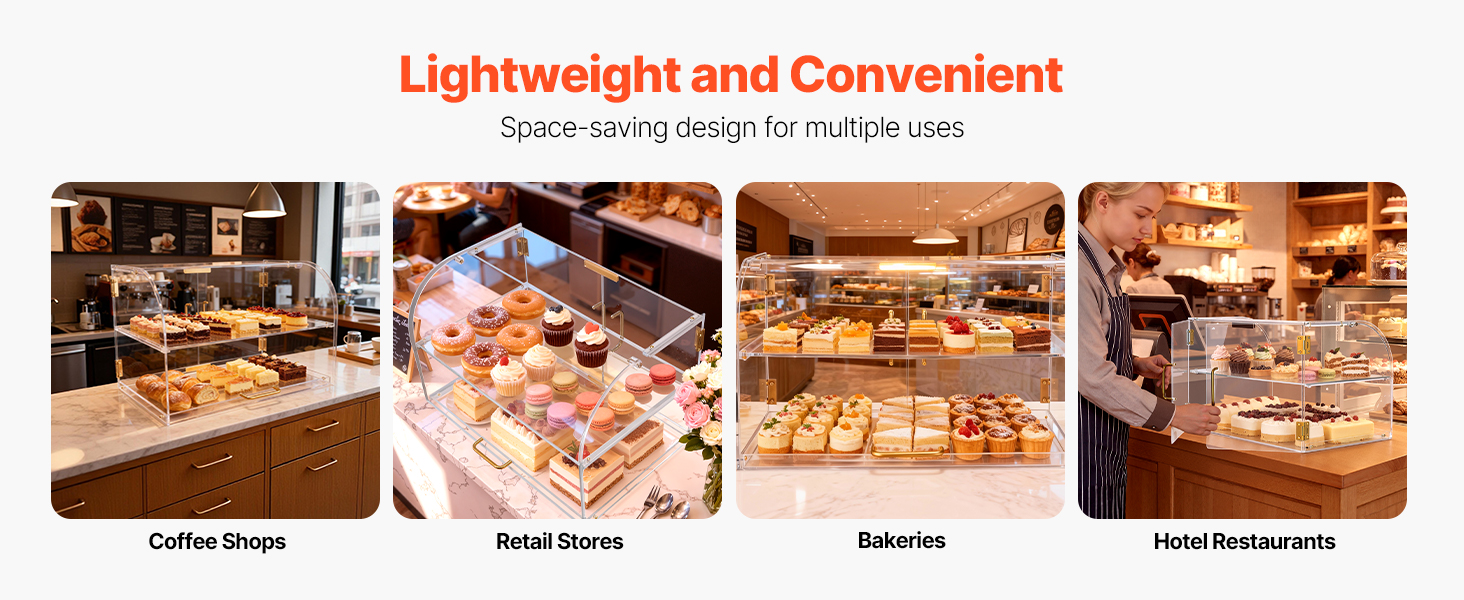 Naše vitrína na potraviny je ideální pro pekárny, kavárny, občerstvení, obchody s potravinami a restaurace a může sloužit také jako vitrína na občerstvení nebo cukrovinky. Její multifunkční design se hodí do jakéhokoli prostředí - od potravinářských trhů až po stánky s dezerty - a zvyšuje prezentaci výrobků a vizuální přitažlivost.