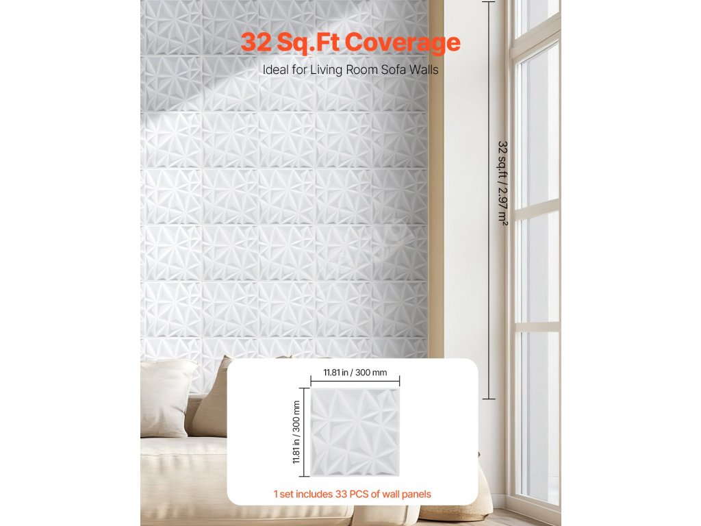 3D nástěnné panely 33 ks PVC 11.81×11.81 in, 32 Sq.Ft, matná bílá