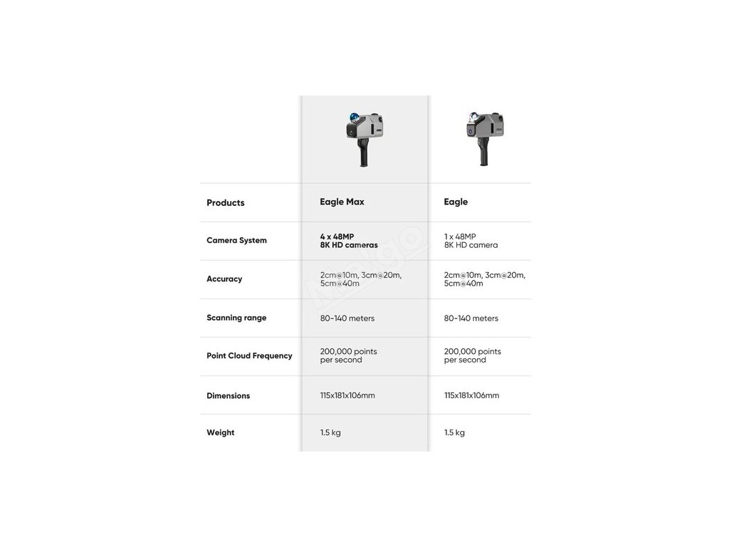 | Obsah balení | 1 x skener Eagle LiDAR 1 x rukojeť 1 x napájecí adaptér PD 1 x 1,5m kabel typu C s dvěma koncovkami 1 x karta TF 128 GB 1 x adaptér USB-C na USB-A |