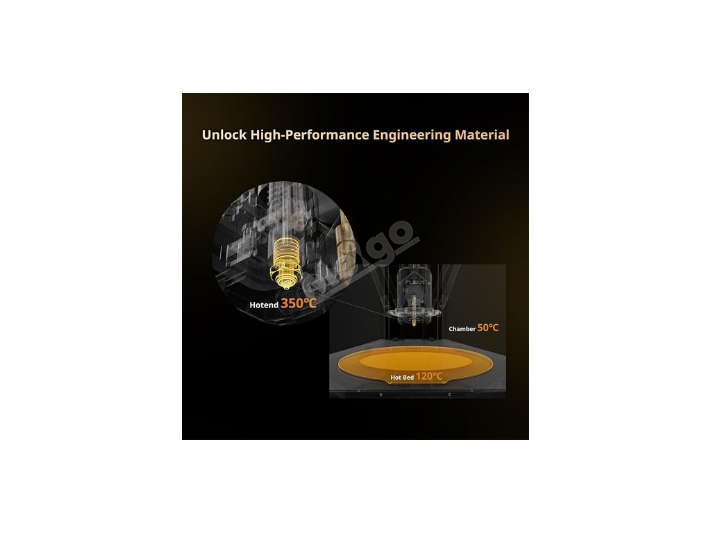 Celokovový horký konec může dosáhnout až 350 °C a díky nejnovější vestavěné teplotní regulační podložce je teplota vždy stabilní. Extrémně vysokoteplotní vícemetalová integrovaná hrdlová tryska je vhodná pro ABS, ASA, PC, PA, PETG, PLA a další spotřební materiály. Podporuje také vysoce výkonné spotřební materiály, jako jsou PPS-CF, PPA-CF/GF, a různé velikosti trysek.