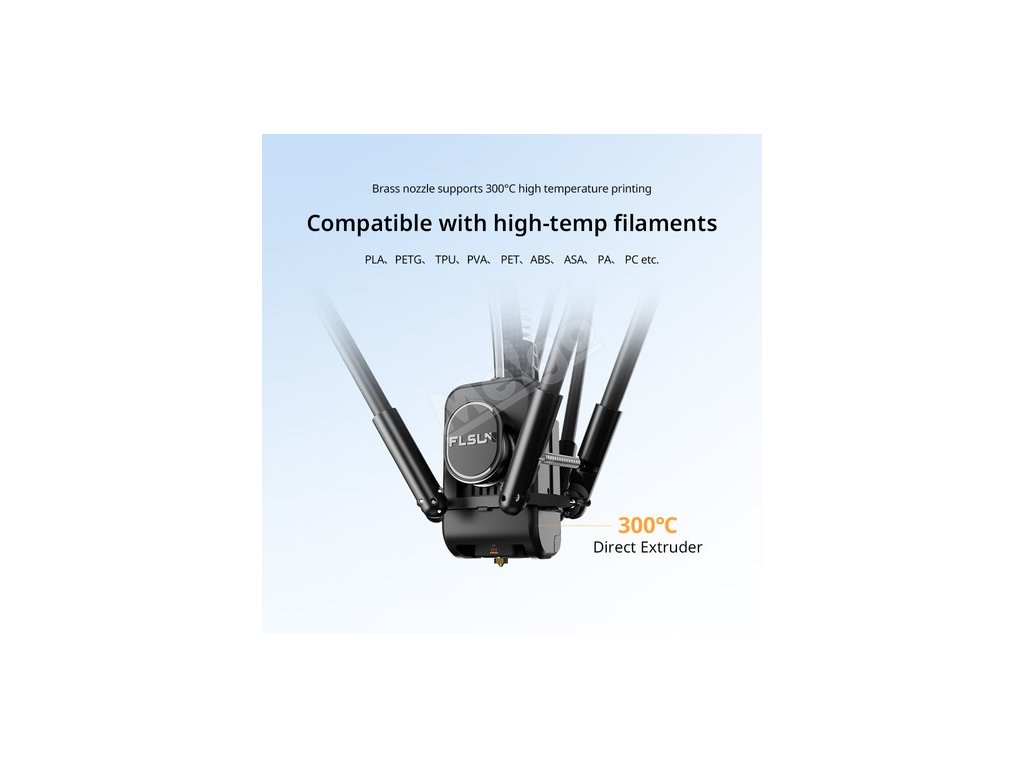 Výkonný extrudér s dvojitým převodem a přímým pohonem, teplota může dosáhnout až 300 °C, úžasná rychlost toku 90 mm³/s, zaručená rychlost tisku, vybavený vnějším krytem pro zajištění teploty v tiskárně, vhodný pro PLA, PETG, TPU, PVA, PET, ABS, ASA, PA, PC a další materiály, výkon je lepší než u stejného typu 3d tiskárny fdm