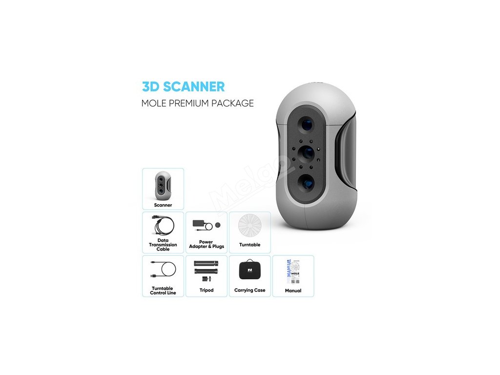 | Obsah balení | 1 x 3D skener krtka 1 x datový kabel 1 x napájecí adaptér 1 x otočný stůl 1 x ovládací linka otočného stolu 1 x stativ 1 x přenosné pouzdro 1 x návod k použití |