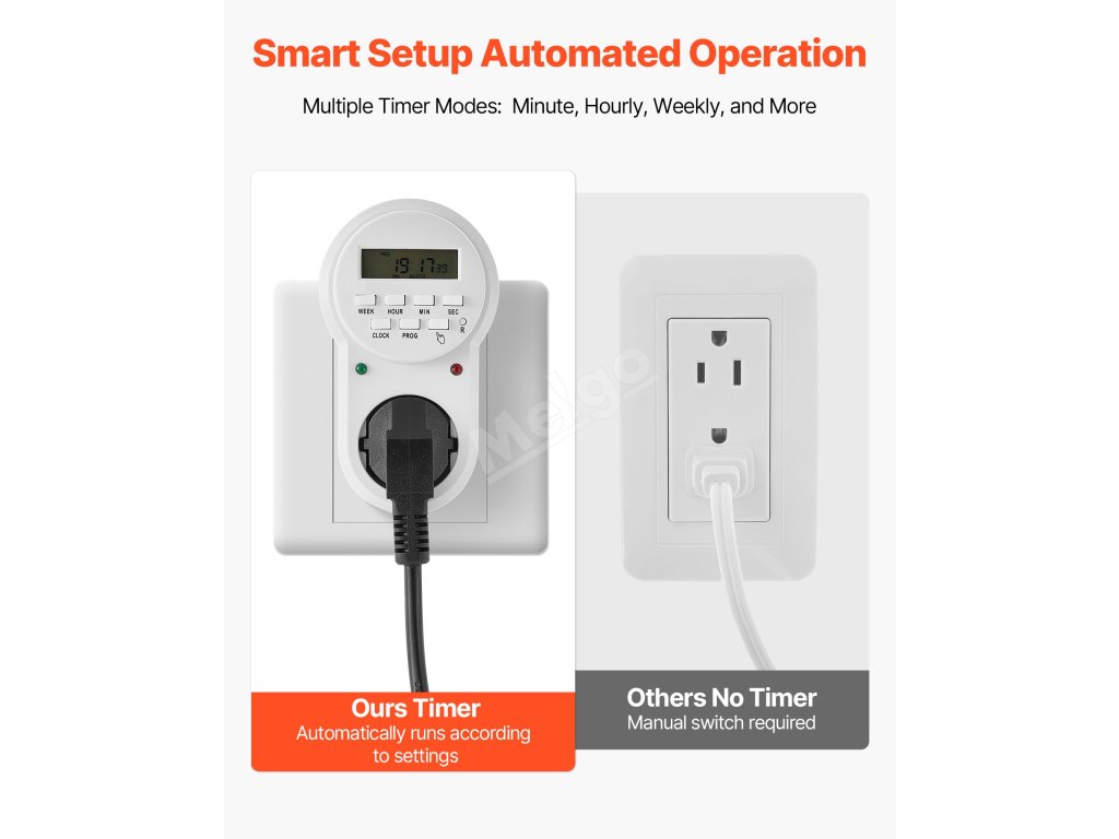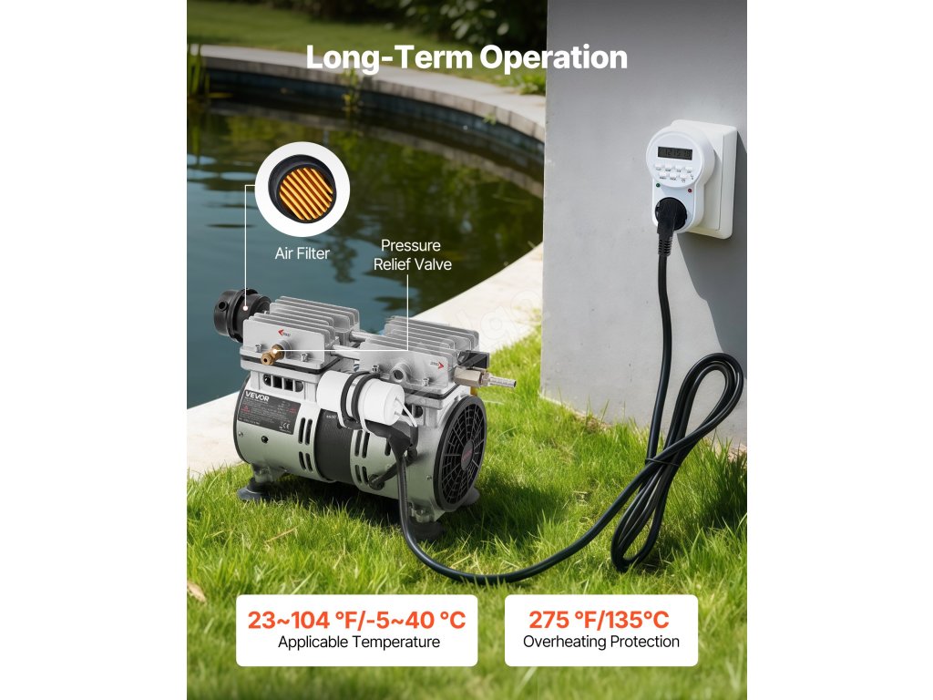 Je vybaven bezpečnostním ventilem, filtračním sítem a zabudovanou ochranou proti přehřátí pro bezpečnější dlouhodobé používání. Obsahuje časovač, který automatizuje cykly zapnutí/vypnutí pro bezdotykové ovládání provzdušňování.
