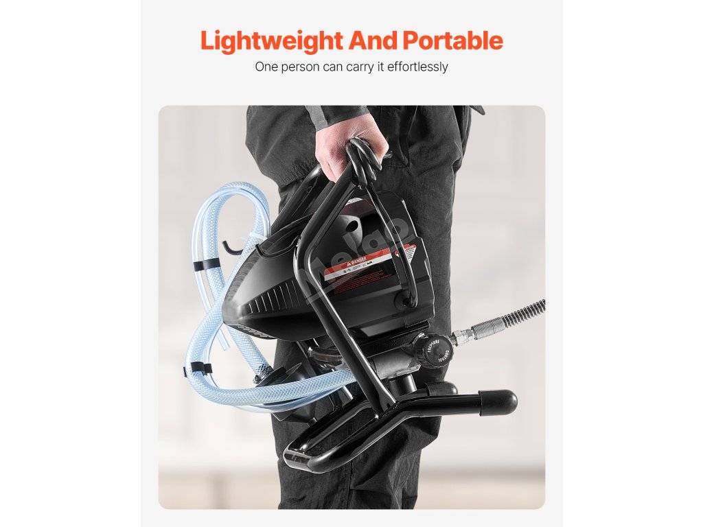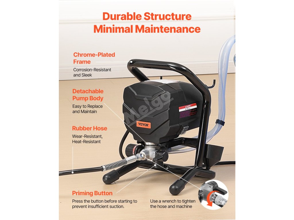 Díky chromovanému rámu je tento vysokotlaký bezvzduchový postřikovač estetický a vysoce odolný proti korozi. Výrazně snižuje riziko ucpání a netěsností a zajišťuje plynulé stříkání. Prodloužená rukojeť umožňuje bez námahy dosáhnout na vysoké povrchy, jako jsou stěny a stropy.