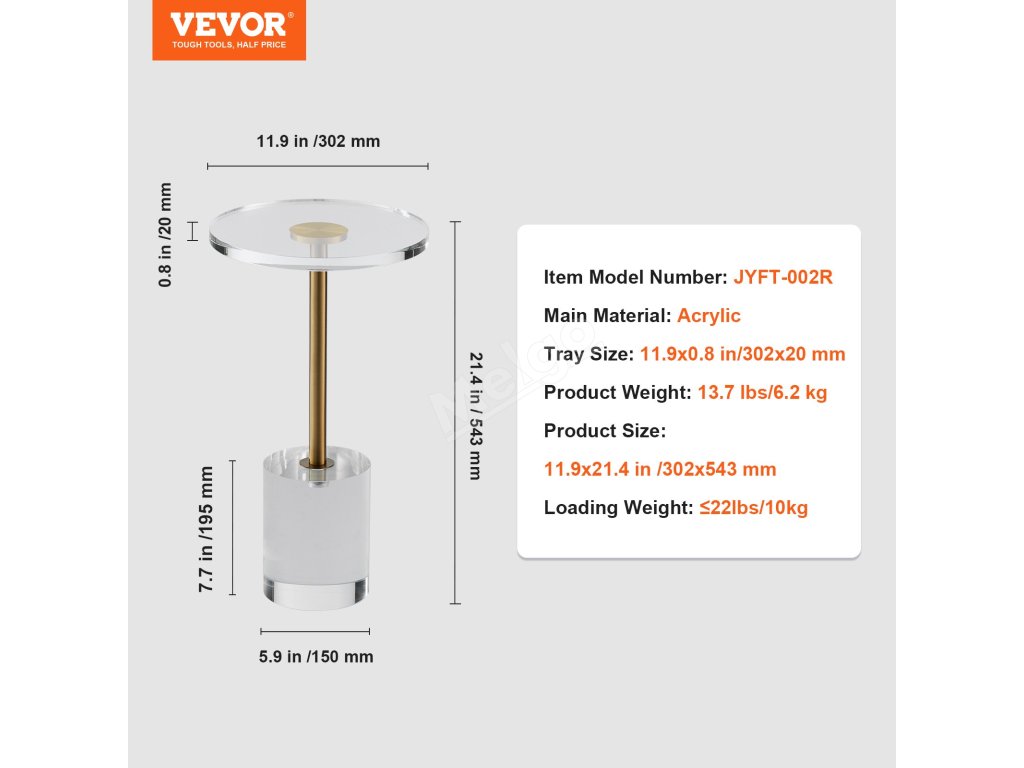 Akrylový příruční stolek, kulatá deska 11.9×11.9 inch výška 21.4 inch