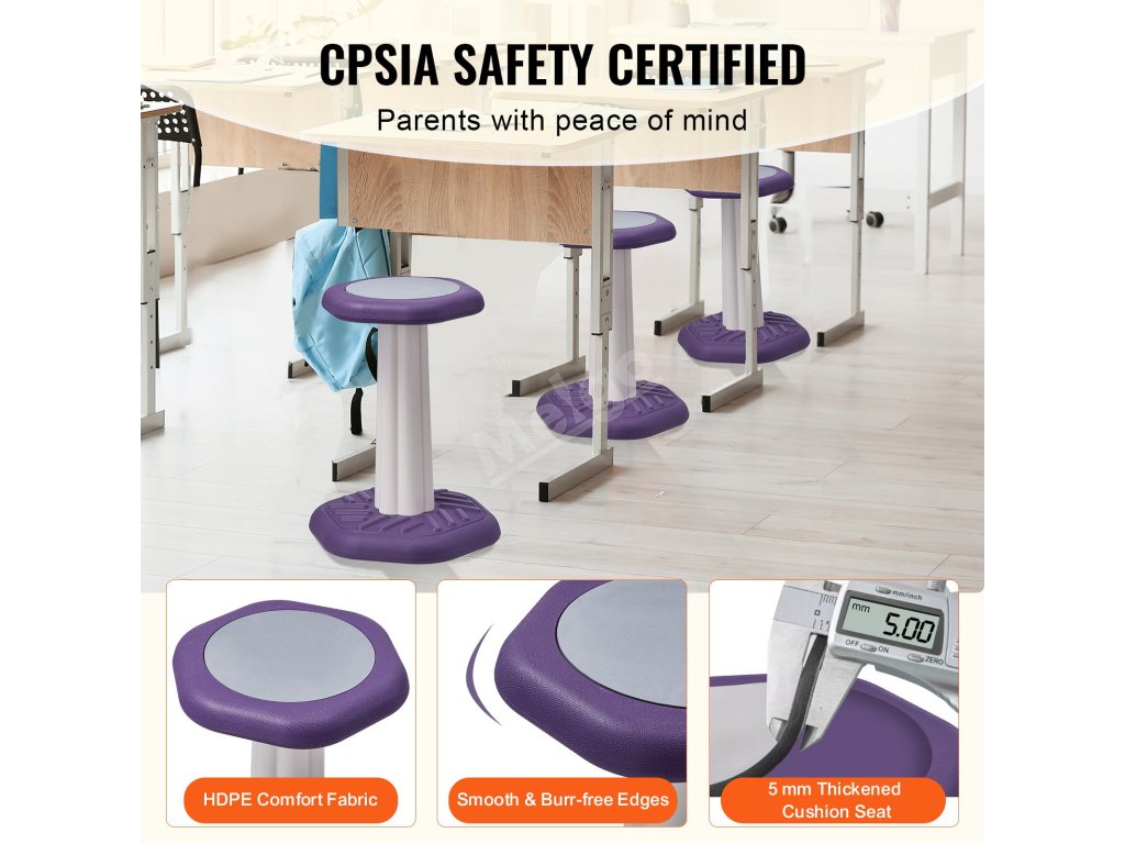 Aktivní židle je vyrobena z vysoce kvalitního materiálu HDPE s certifikací CPSIA a má hladké hrany bez otřepů, což zajišťuje bezpečnost dětí před nárazy nebo zraněním. Pohodlí zvyšuje polštářek o tloušťce 5 mm, díky němuž je sezení pohodlnější i při delším sezení.