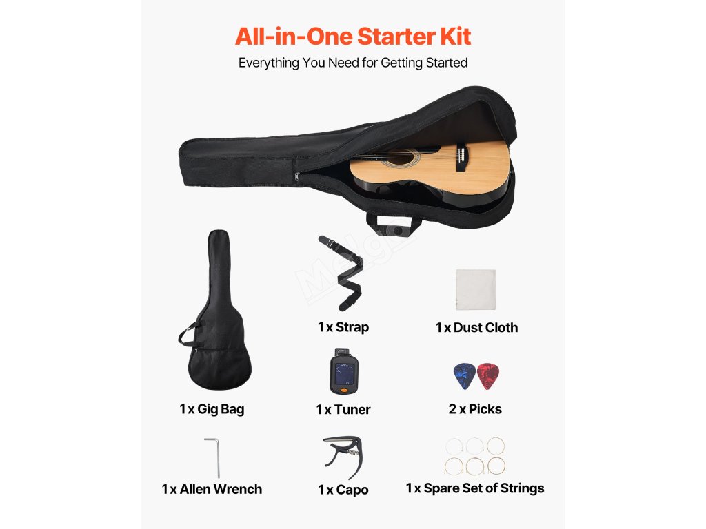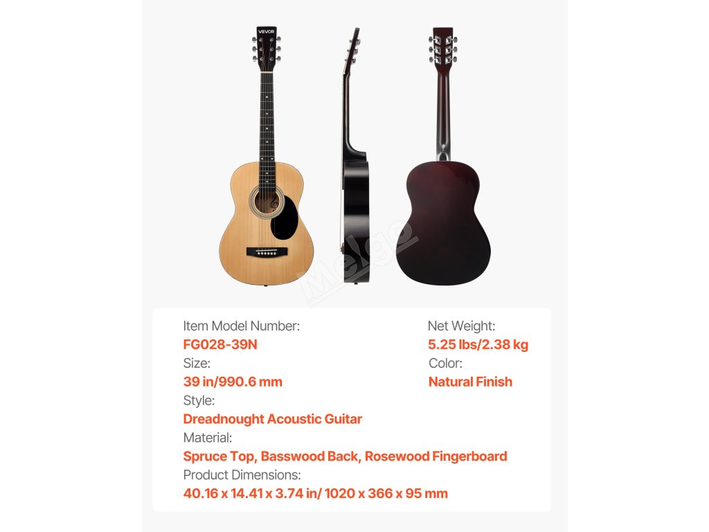 Tato akustická kytara má standardní velikost, vyvážený tón a pohodlný úchop pro snadné hraní. Je ideální pro začátečníky i cvičence a zaručuje radostný a bezproblémový hudební zážitek.