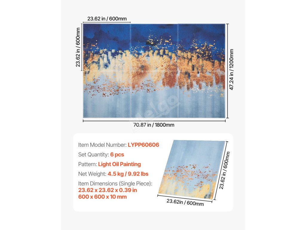 | Rozměry položky (jeden kus) | 600 x 600 x 10 mm / 23,62 x 23,62 x 0,39 palce |