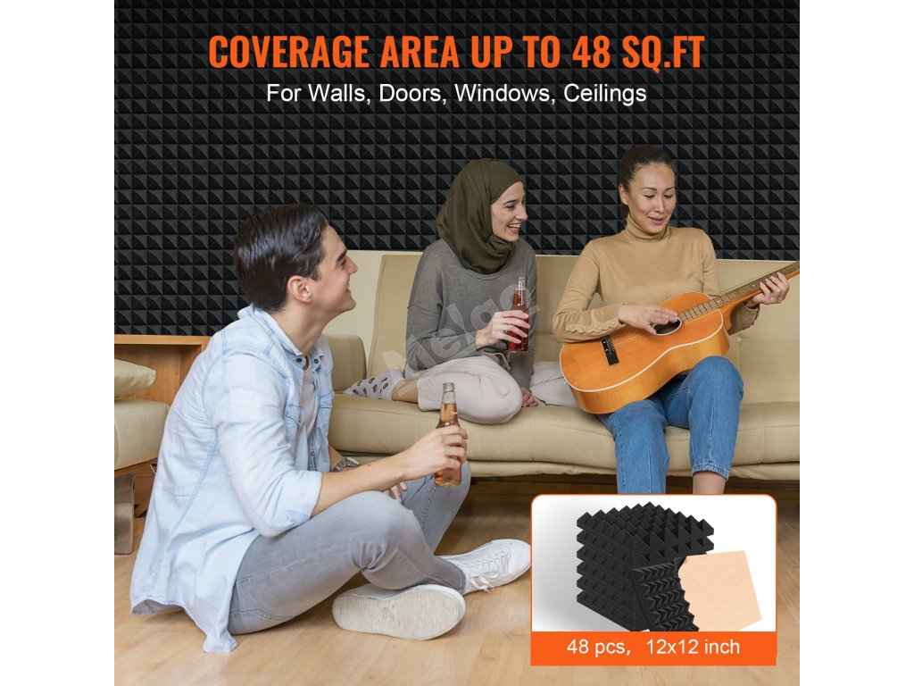 Akustické pěnové panely 48 ks 12×12×2 inches lepící pyramidové černé