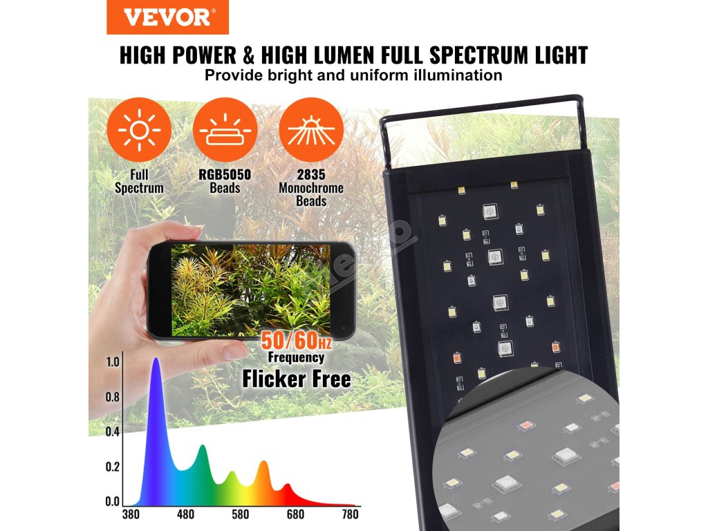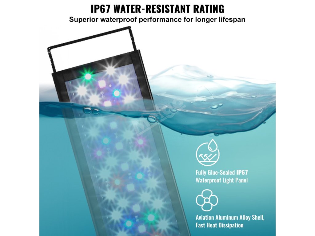 Probuďte se do barev a objevte krásu přírody. Akvarijní světlo VEVOR je vybaveno vysoce svítivými LED diodami RGB5050 s plným spektrem a 2835 monochromatickými LED diodami, které poskytují živé a rovnoměrné osvětlení a zároveň šetří energii, zajišťují dlouhou životnost a zlepšují atmosféru vodního prostředí.