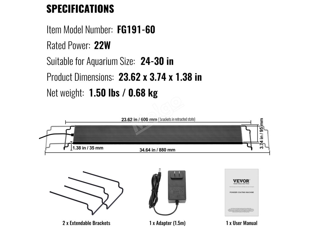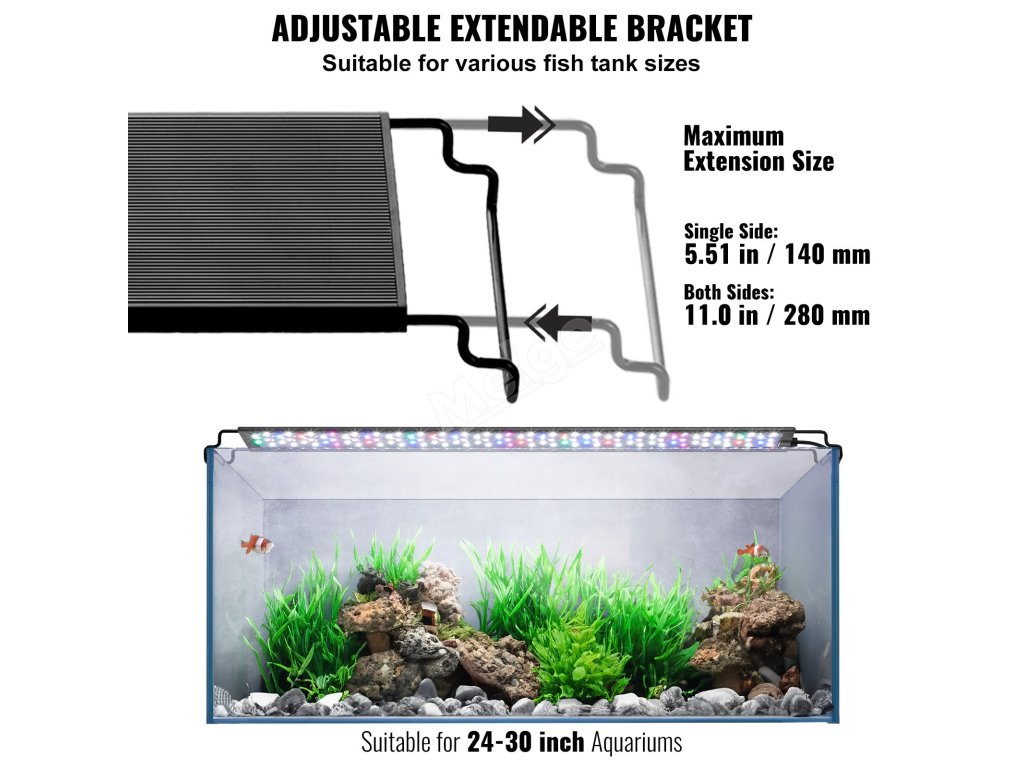 Snadno se přizpůsobí prostoru vašeho akvária, aniž by zabíralo příliš mnoho místa. Naše akvarijní světlo je vyrobeno z 1,2mm pláště z hliníkové slitiny pro účinný odvod tepla, je vhodné pro nádrže o velikosti od 24 do 30 palců a bez problémů se začlení do vaší akvarijní sestavy, aby působilo vizuálně úžasně.