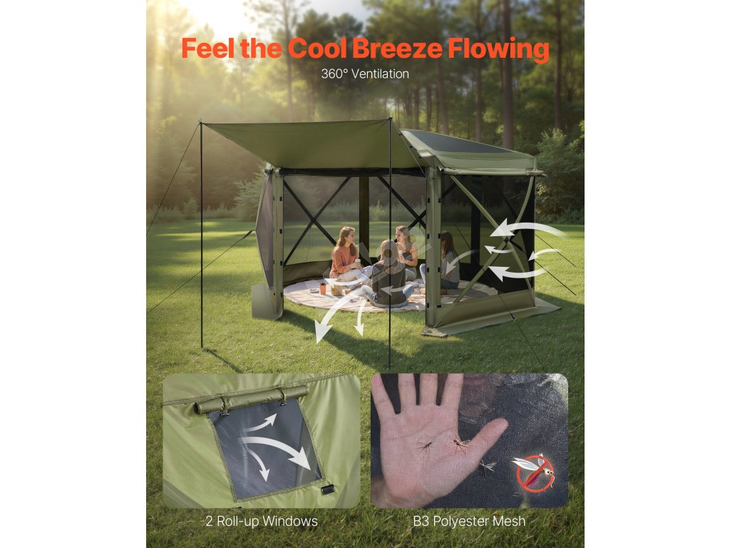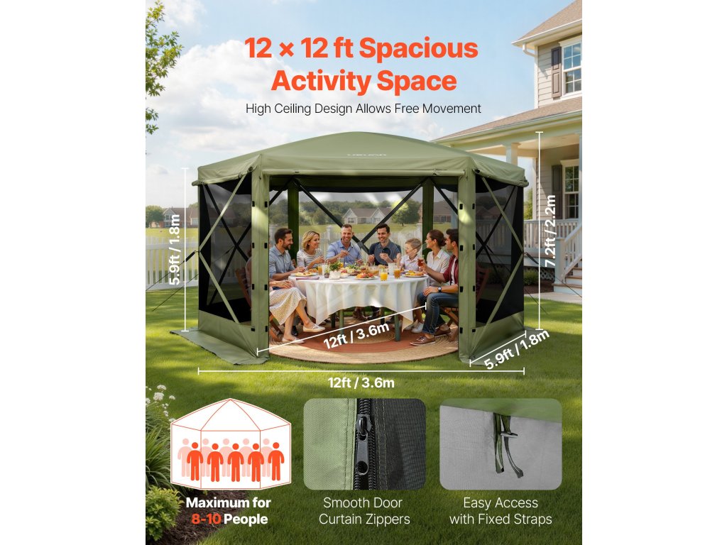 Velký altán se zástěnou nabízí prostorný prostor pro aktivity a sluneční clonu pro setkání rodiny a přátel.Velikost 12x12 stop pojme 8-10 osob.7. stříška vysoká 2 stopy umožňuje pohodlné stání a pohyb.