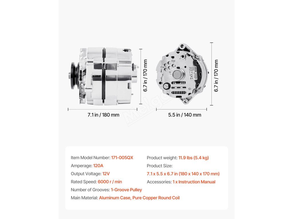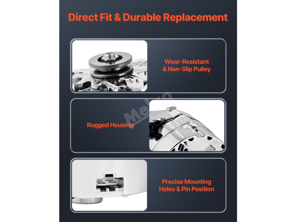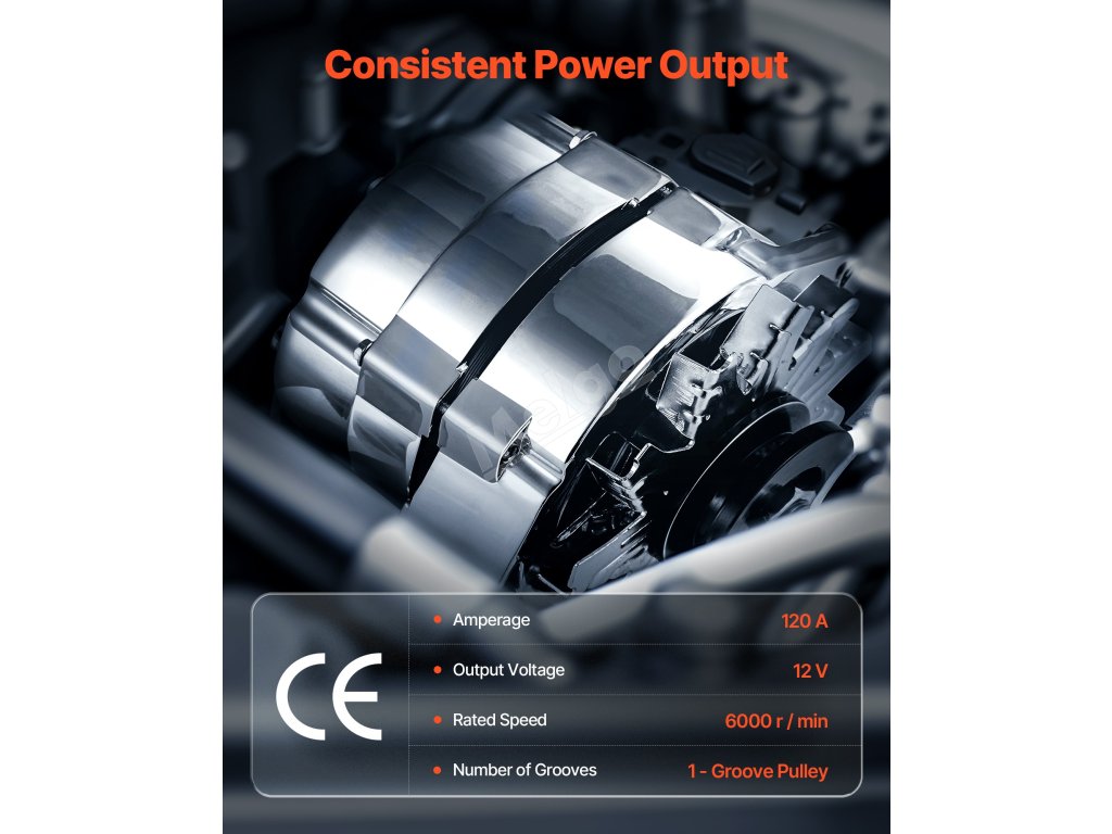 Náš náhradní alternátor má čistě měděné cívky, které mají lepší životnost než hliníkové. Hliníkový kryt a chladicí ventilátor zvyšují odvod tepla. Poskytuje stabilní výstupní proud 120 A, který podporuje náročná zařízení, jako je klimatizace a prémiové zvukové systémy.