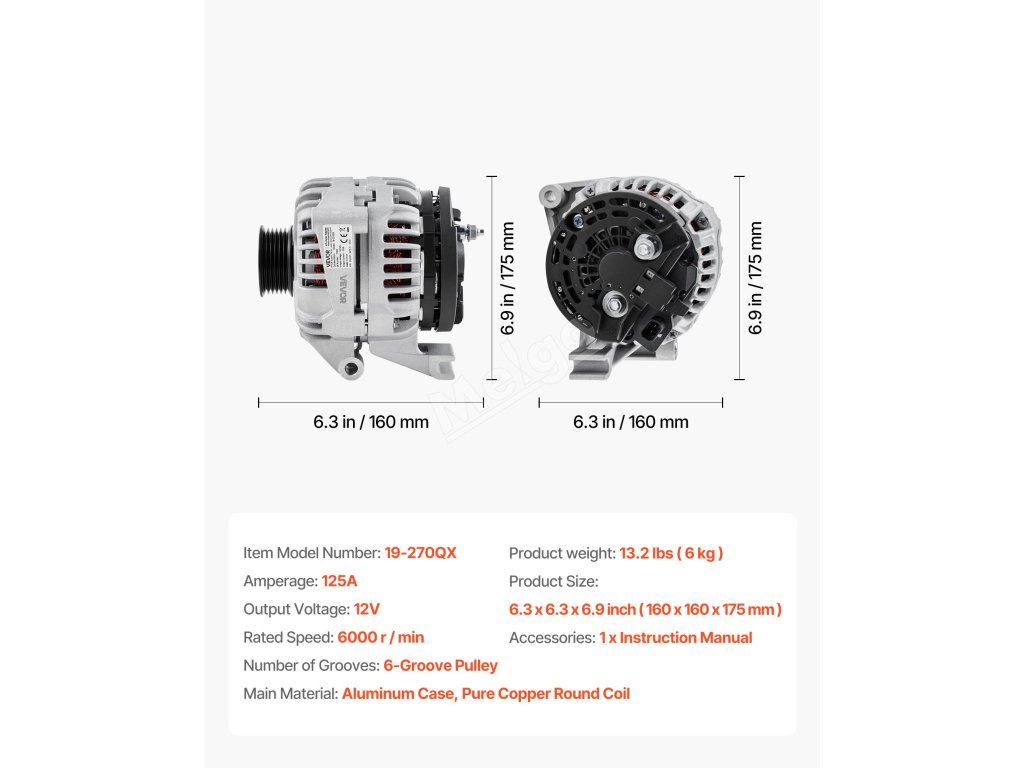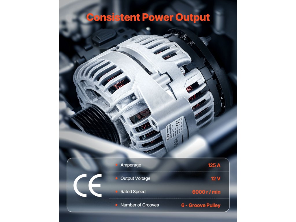 Náš náhradní alternátor má čistě měděné cívky, které mají lepší životnost než hliníkové. Hliníkový kryt a chladicí ventilátor zvyšují odvod tepla. Poskytuje stabilní výstupní proud 125 A, který podporuje zařízení s vysokou zátěží, jako jsou klimatizace a prémiové audiosystémy.