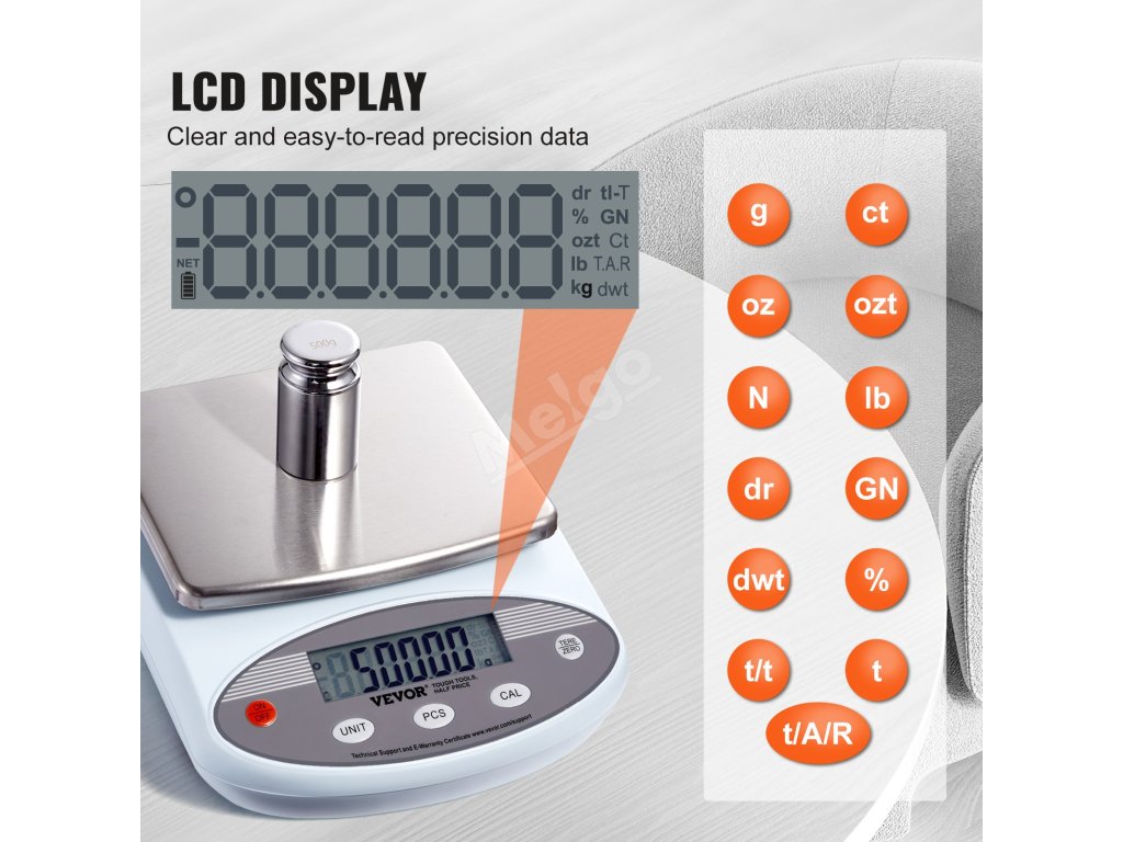 Laboratorní analytické váhy VEVOR jsou vybaveny vysoce přesnými senzory s rychlou odezvou 3 sekundy, které zajišťují rychlé a přesné vážení s přesností 0,01 g a maximální kapacitou 2000 g.