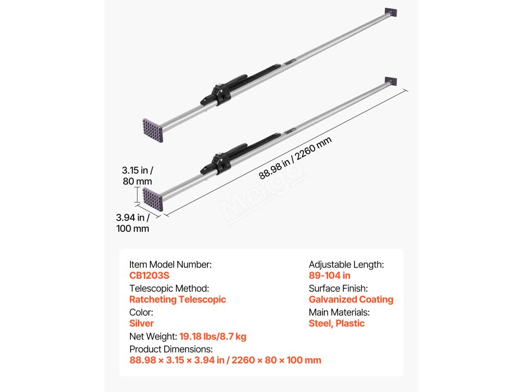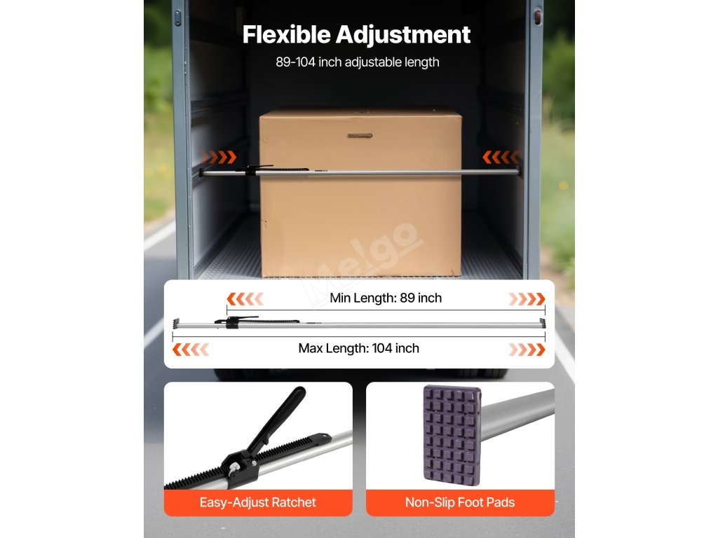 Teleskopická nosná tyč je volně nastavitelná v rozmezí 89 až 104 palců a snadno se přizpůsobí různým typům vozidel. Ať už se jedná o nákladní automobily, skříňové vozy, přívěsy nebo návěsy, udrží náklad bezpečně na místě.
