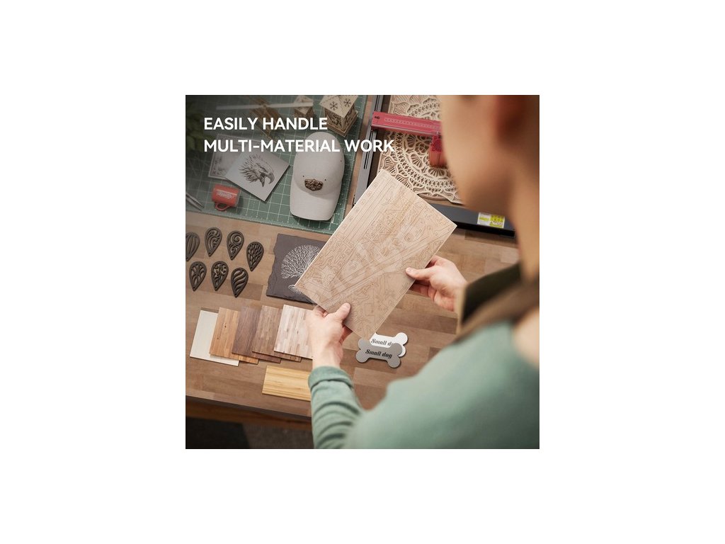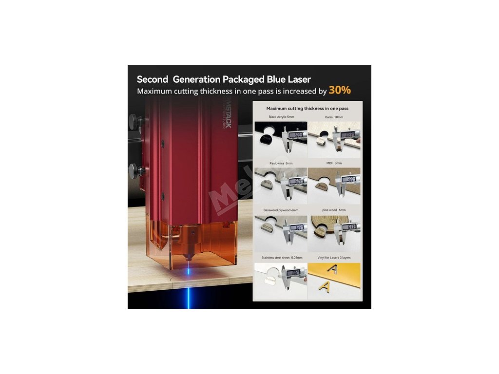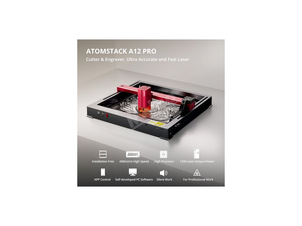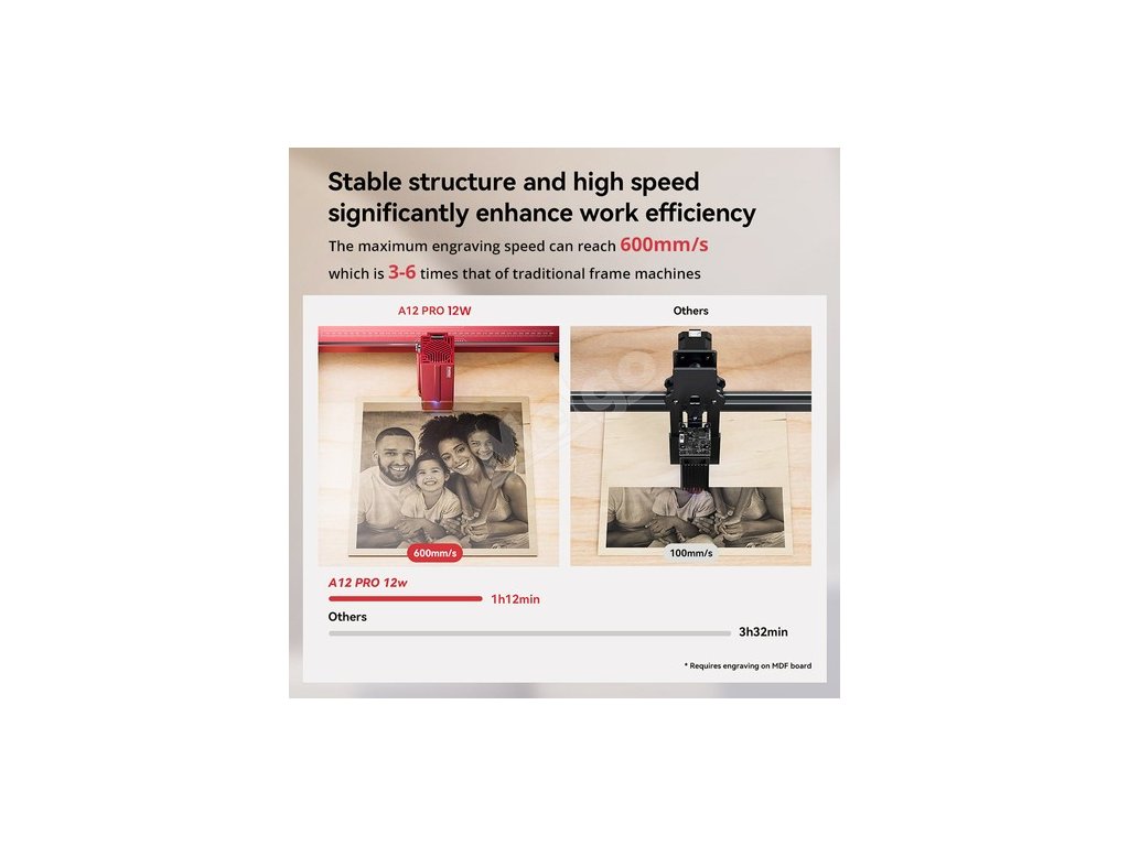 Díky použití nejstabilnějšího laserového modulu s vysokým optickým výkonem 12 W a nejnovější technologii stlačování laserového bodu dokáže A12 Pro současně řezat 8mm desky z paulovnie, 5mm černé akrylátové desky, 6mm překližku z baskřídlového dřeva apod. Využívá také konstrukci s pevným zaostřením a dokáže rychle a přesně zaostřit během 10 sekund.