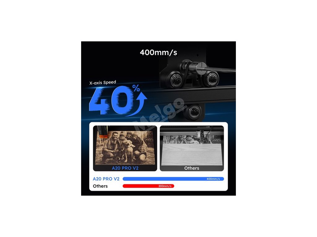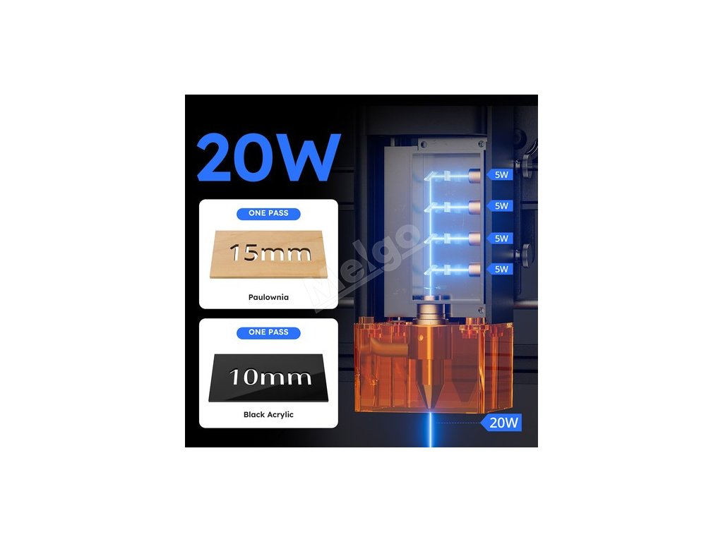 Díky silnému výstupnímu výkonu laseru 20000 mW vyniká ATOMSTACK A20 Pro V2 vysokou energií při řezání a přesném gravírování Rychlost gravírování až 400 mm/s výrazně zkracuje dobu zpracování materiálů, jako je dřevo, akryl a kov