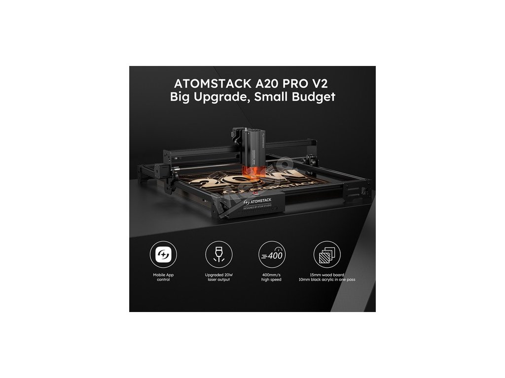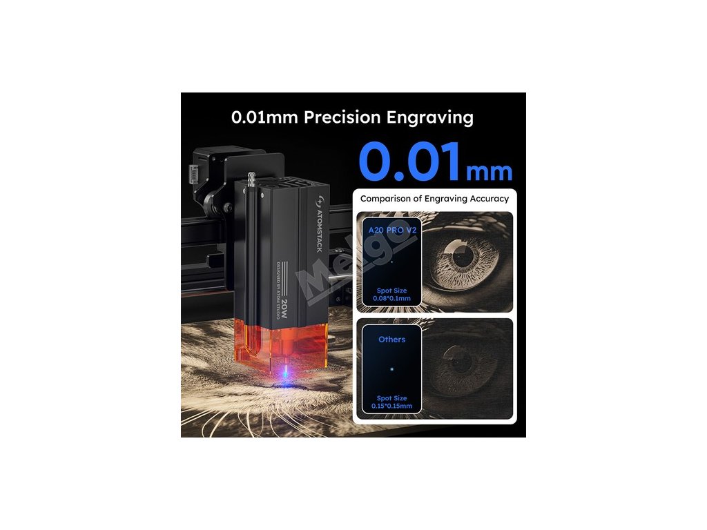 Laserový gravírovací stroj ATOMSTACK A20 Pro V2 je vybaven pokročilou, nezávisle vyvinutou základní deskou pro vyšší výkon, inteligenci a stabilitu. Unikátní technologie komprese bodů poskytuje body o rozměrech 0,08 x 0,1 mm, což zajišťuje přesné gravírování. Úroveň výstupního výkonu laseru: 20000 mW, třída laseru: 4.