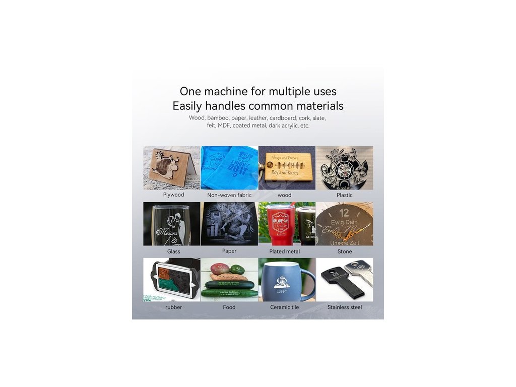 Stroj je k dispozici ve verzích se 7W a 12W diodovým laserem, které mohou zpracovávat širokou škálu materiálů, jako je dřevo, bambus, papír, kůže, karton, korek, břidlice, MDF, potažený kov a tmavý akryl. S volitelným infračerveným laserovým modulem podporuje také vysoce přesné gravírování do kovu, kůže a plastu, což uživatelům umožňuje zvládnout různé aplikace v kreativních, komerčních nebo průmyslových projektech.