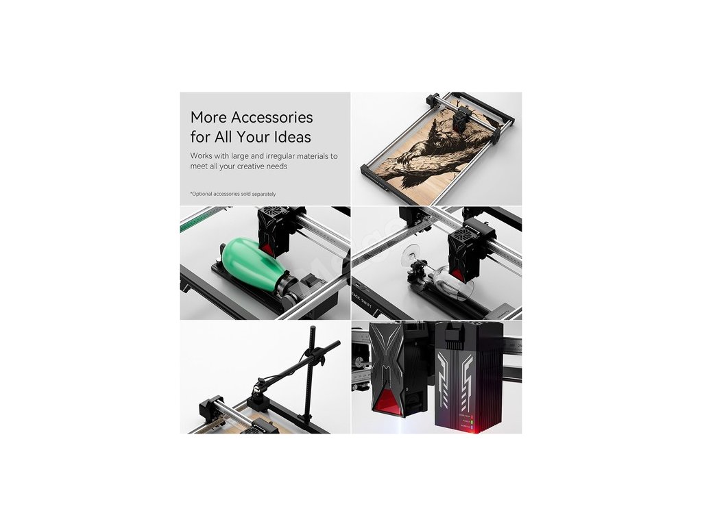 K dispozici je řada příslušenství, které rozšiřuje možnosti gravírování. Rotační válec umožňuje gravírování na válcovité předměty, jako jsou sklenice, pera a sklenice na víno, zatímco rotační sklíčidlo podporuje gravírování 360° na prsteny, náramky a nepravidelné kruhové předměty. Další možnosti, jako je kamera, prodlužovací osa, infračervený laser, voštinový panel a vzduchový asistent, dále zvyšují uživatelský komfort a splňují nejrůznější požadavky na gravírování.