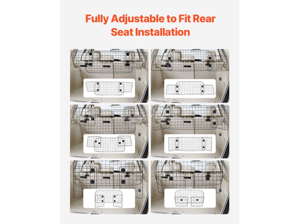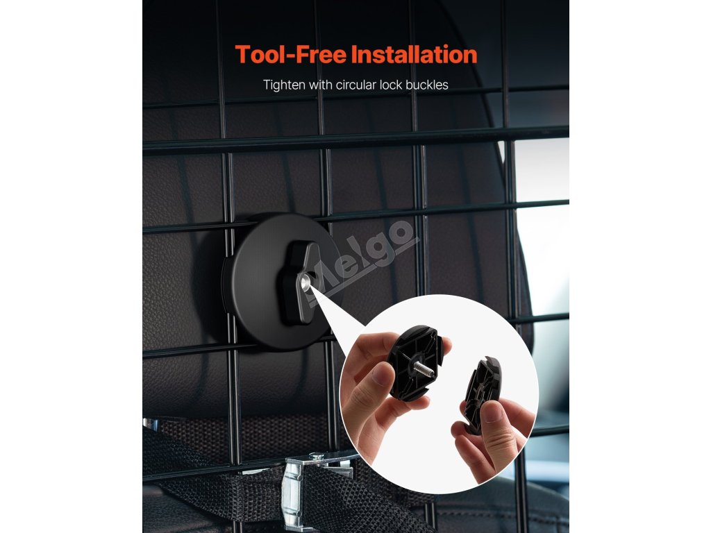 Tuto zábranu pro psy lze snadno nastavit bez nutnosti vrtání. Připevněte ji k opěrkám hlavy zadních sedadel pomocí kulatých zámků a nylonových popruhů. Součástí balení je přídavná elastická šňůra pro větší stabilitu, která zajistí, že zábrana zůstane pevně na svém místě.