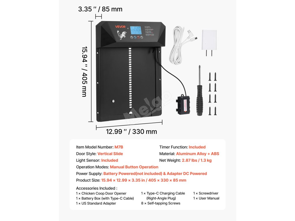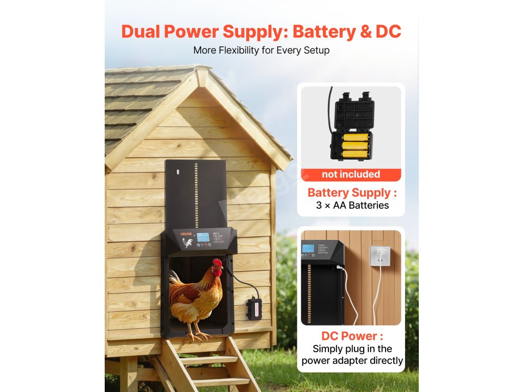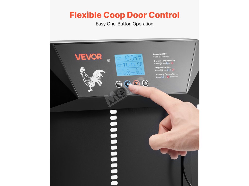 Tato dvířka pro kuřata jsou vybavena velkým displejem, který přehledně zobrazuje čas, stav dvířek a naplánovaná nastavení. Nastavení časovačů, změna režimů nebo kontrola stavu je jednoduchá a intuitivní.
