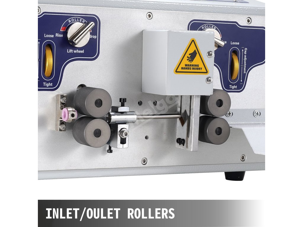 Elektrický odizolovací nástroj je vybaven vstupním a výstupním válcem. Jejich přítlak můžete nastavit otáčením oranžových spínačů za nimi, abyste zohlednili dráty z různých materiálů.