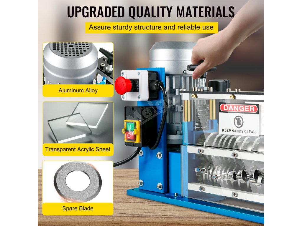Tento stroj na odizolování šrotu je vyroben z vysoce kvalitní hliníkové slitiny a akrylových materiálů, je lehčí, přenosnější a odolnější. Ocelová základna je navržena tak, aby vydržela.