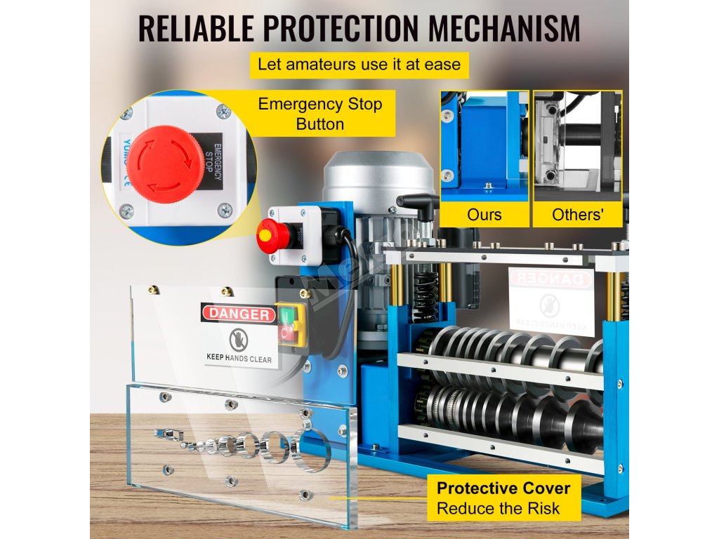 Elektrický odizolovací stroj byl doplněn o tlačítko nouzového zastavení a průhledný ochranný plášť, které tvoří důmyslný bezpečnostní mechanismus, jenž zajišťuje bezpečné používání a zabraňuje náhodnému stisknutí ruky.