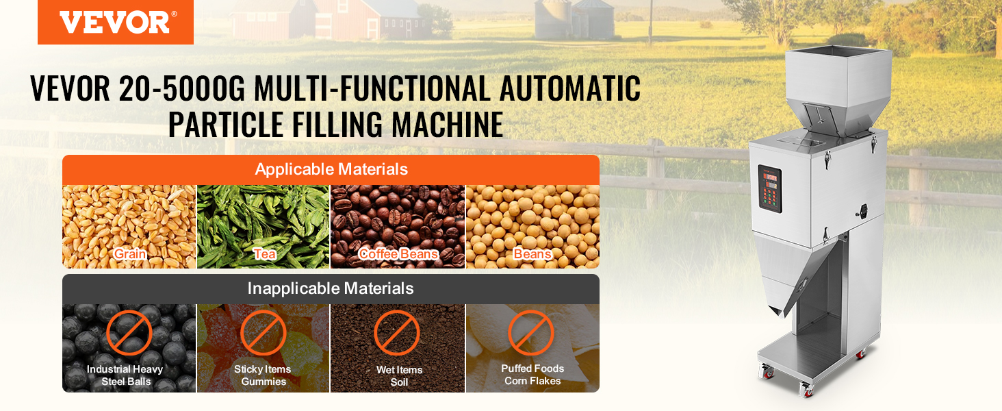 Před zakoupením našeho stroje na plnění částic si prosím uvědomte, že některé materiály nejsou použitelné. Ocelové kuličky nebo skleněné kuličky mají tendenci vytvářet statickou elektřinu. Lepivé látky nemusí hladce proudit a mokré nebo nadýchané potraviny mohou způsobit ucpání.