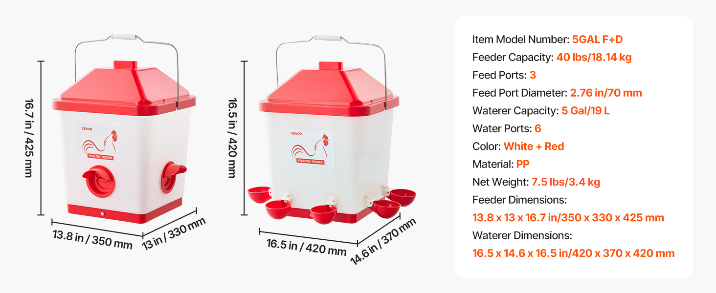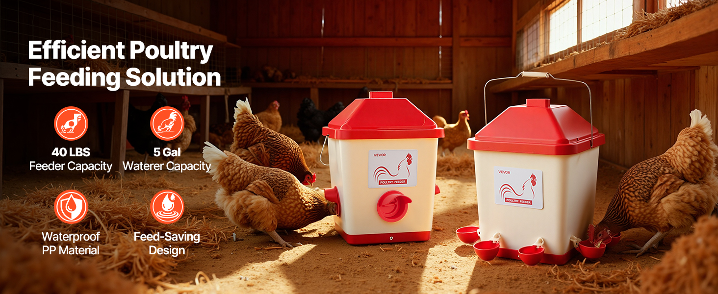 Toto automatické krmítko pro kuřata obsahuje automatické krmítko o kapacitě 40 liber a automatickou napáječku o kapacitě 5 galonů, které poskytují vše, co potřebujete ke krmení více kusů drůbeže.