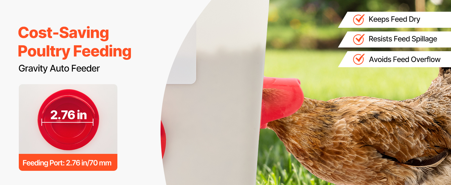 Díky gravitačnímu krmení má automatické krmítko pro drůbež krmné otvory o průměru 2,76 palce, které usnadňují krmení drůbeže a zabraňují rozsypávání krmiva, takže krmivo zůstává suché, čerstvé a bez odpadu.