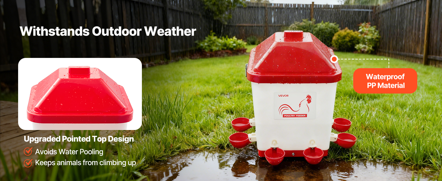 Automatické krmítko i napáječka pro kuřata jsou vyrobeny z voděodolného PP s ostrou horní částí, která zabraňuje hromadění vody a zabraňuje zvířatům šplhat nebo sedat, čímž udržuje kurník čistý.