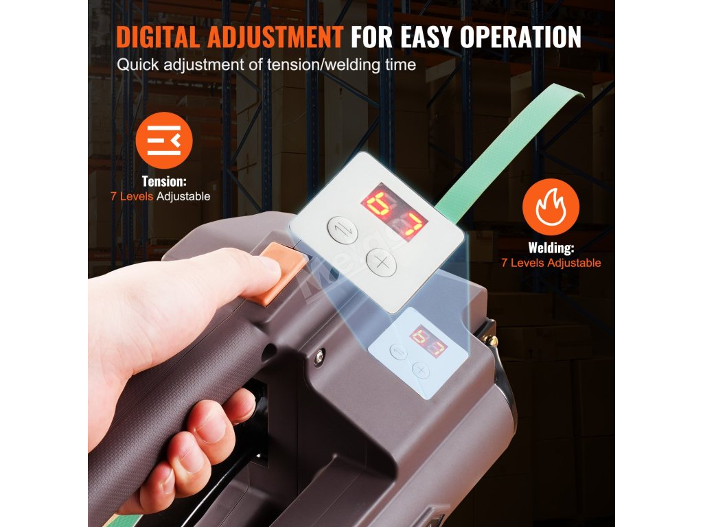 Nastavení svařovacího napětí a času je velmi snadné díky digitálnímu displeji našeho páskovače. Na výběr je několik nastavení, která vám usnadní a urychlí práci. Napínání, svařování a řezání probíhá v jednom zařízení, takže se můžete rychle pustit do práce.