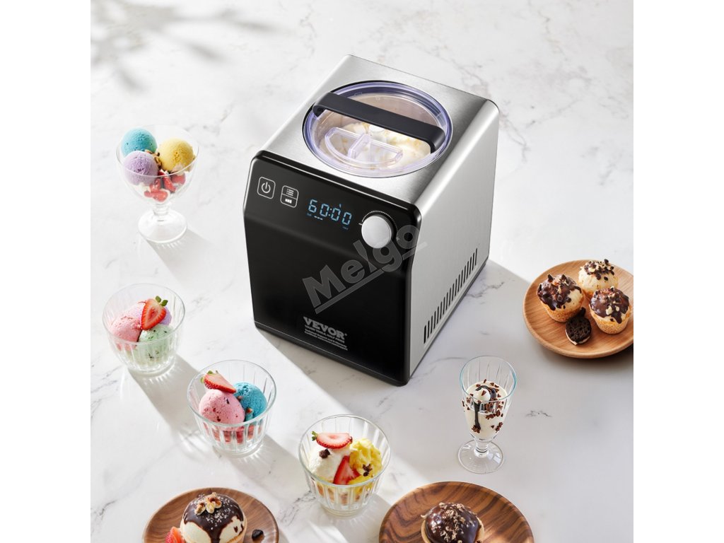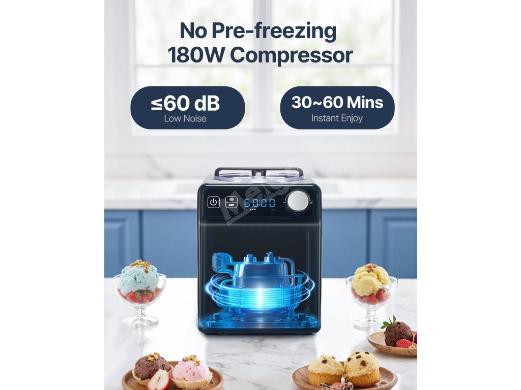 Tento domácí zmrzlinovač nabízí snadné ovládání a schopnost rychle vyrobit zmrzlinu za 1 hodinu. Díky výkonnému 180W kompresoru a hlučnosti menší než 60 dB během provozu dokáže jeho 2QT kapacita vyrobit přibližně 15 kopečků zmrzliny, což plně uspokojí potřeby velké rodiny.
