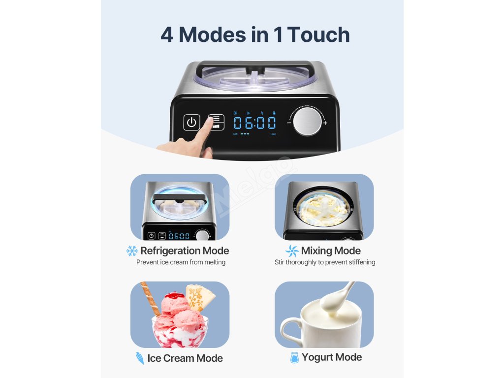 Má režimy zmrzliny, jogurtu, chlazení a mixování. Pracovní režim si můžete zvolit podle svých potřeb. Pokud chcete během výrobního procesu přidat ovoce/ořechy nebo jiné přísady, můžete stisknout tlačítko pauzy.