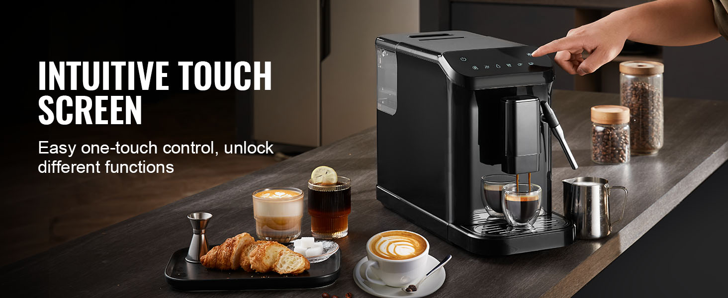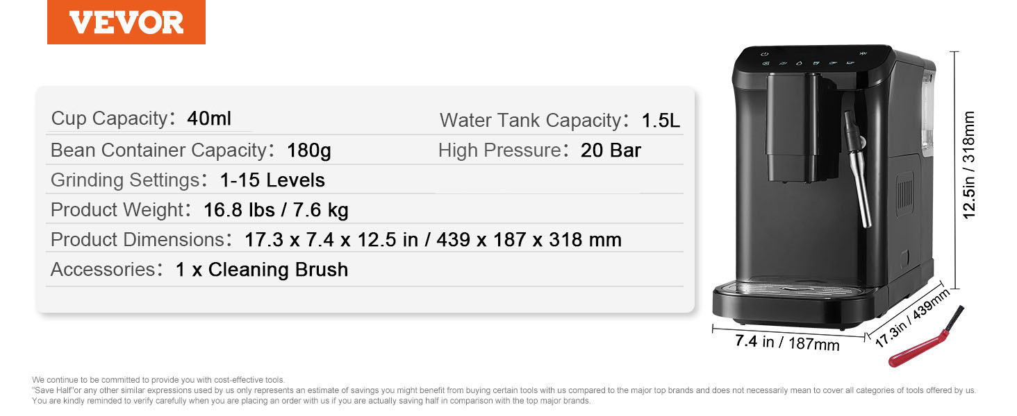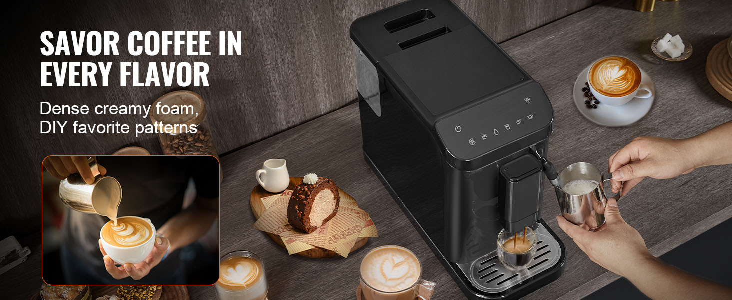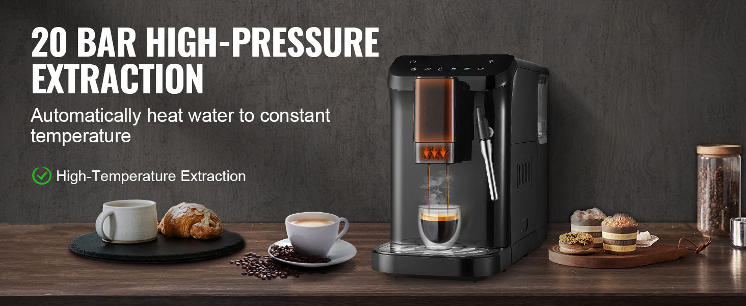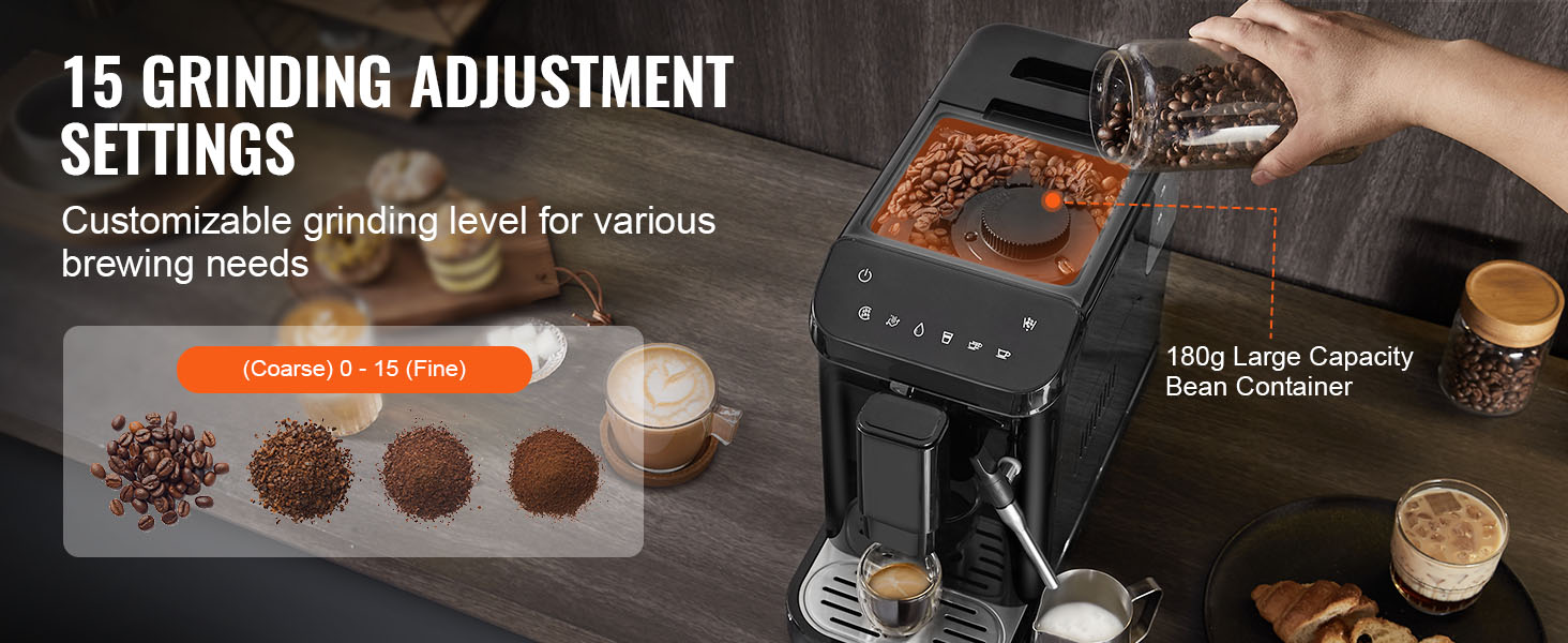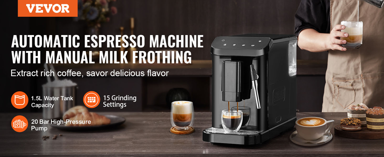 Automatické espresso VEVOR je dokonalou kombinací pohodlí a kvality. Díky vestavěnému mlýnku, 15stupňovému nastavení mletí, systému tlaku 20 barů a výkonné tyčince na napěnění mléka si můžete bez námahy připravit bohaté a aromatické espresso podle své chuti.
