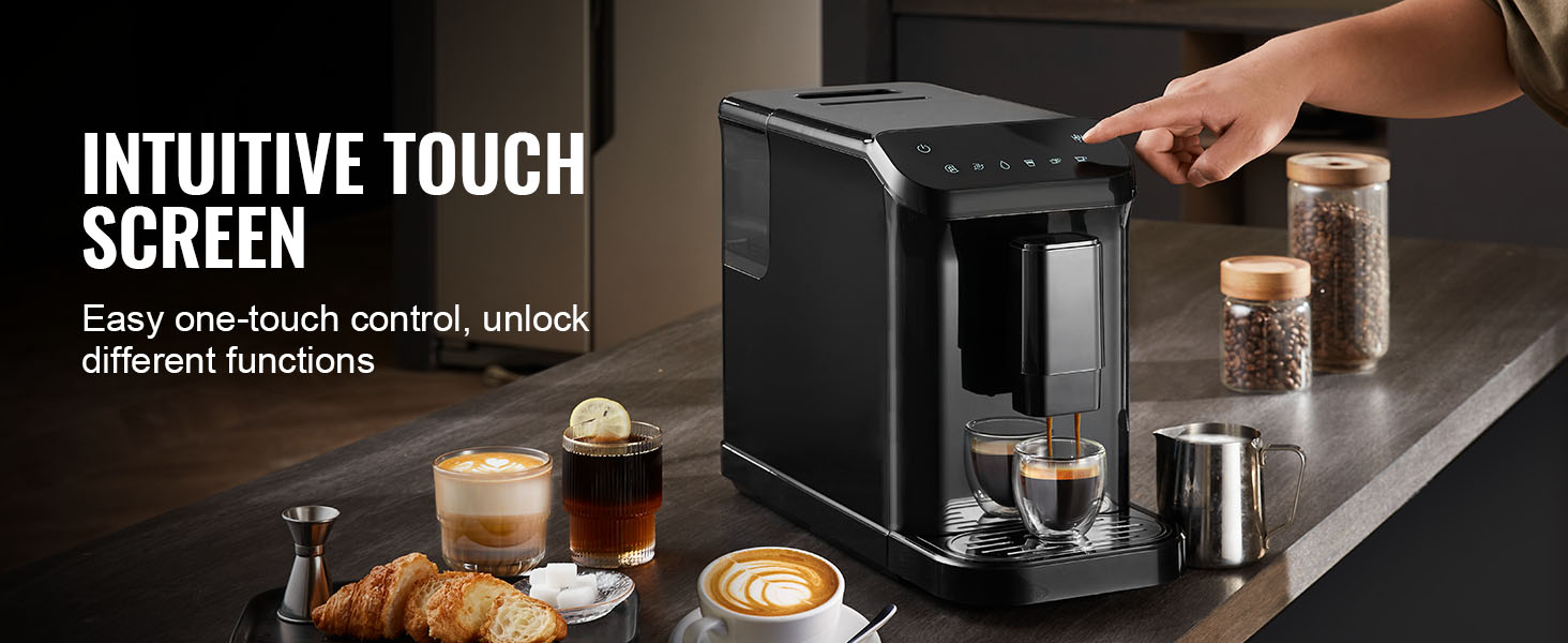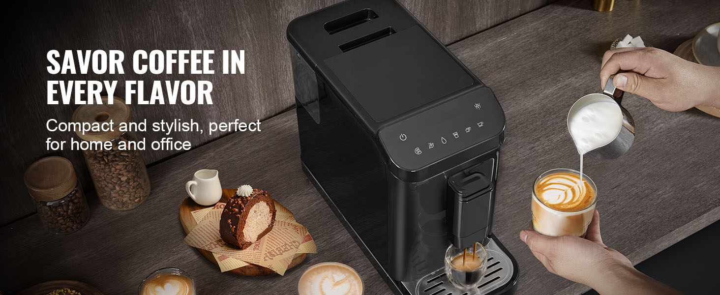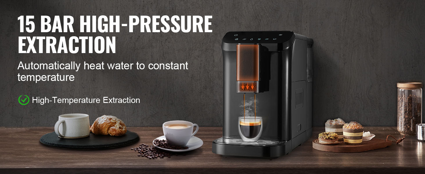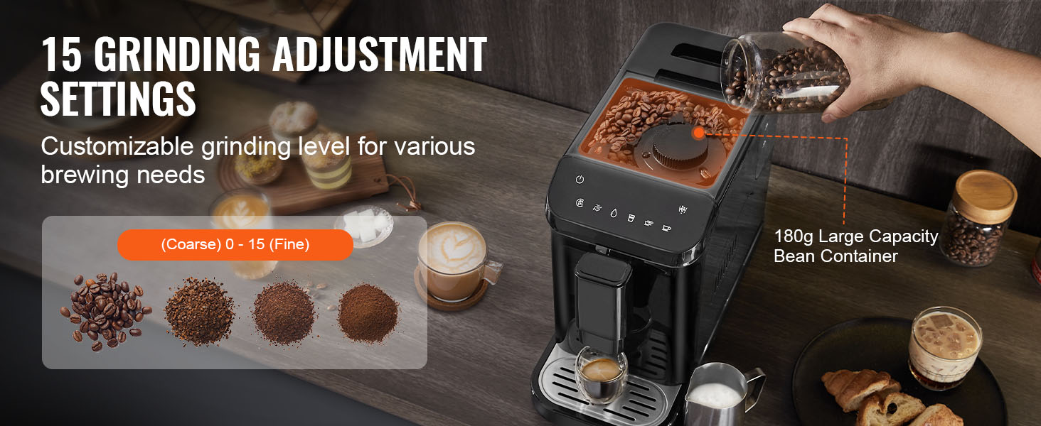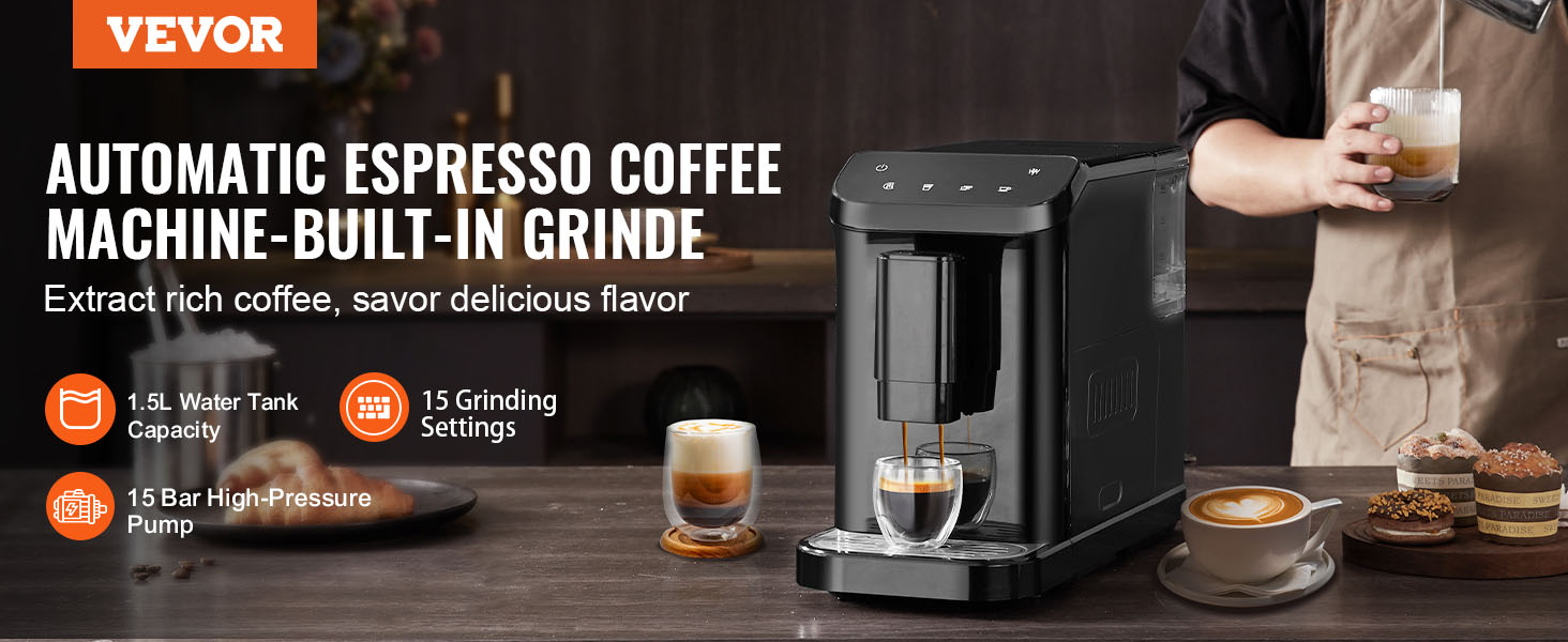 Automatické espresso VEVOR kombinuje pohodlí a výkon, aby vám přineslo dokonalý šálek kávy. Díky vestavěnému mlýnku s 15 nastavitelnými parametry a 15barové vysokotlaké extrakci bez námahy přemění vaše oblíbená zrna na bohaté a aromatické espresso.