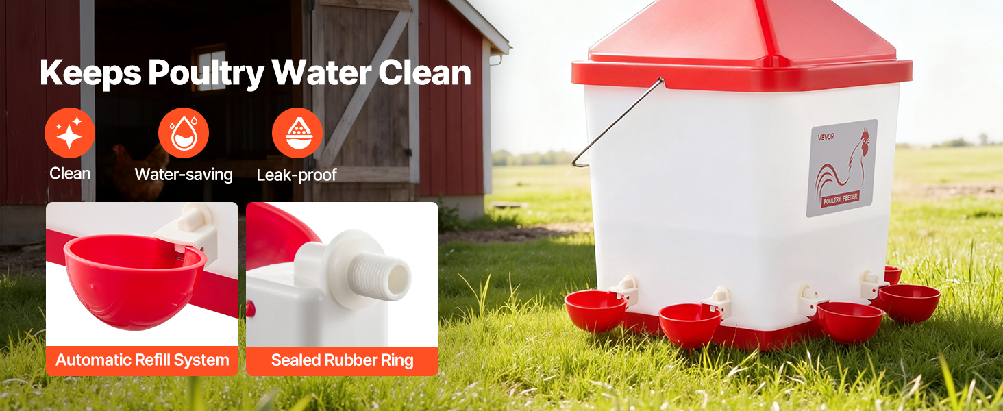 Automatická napáječka pro drůbež je vybavena vestavěným automatickým ventilem, který doplní vodu do misky vždy, když je hladina vody nízká; není nutné ji doplňovat ručně. Udržuje krmný prostor čistý a šetří vodu, čímž usnadňuje a zefektivňuje péči o drůbež.