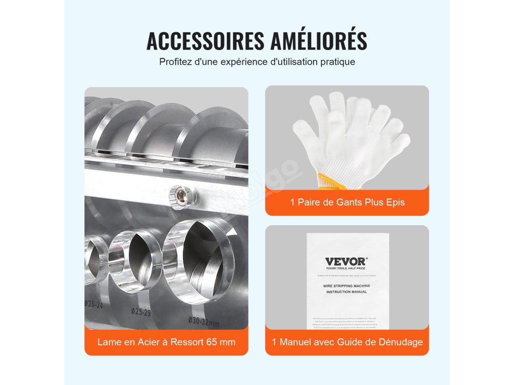 Elektrický odizolovací stroj VEVOR sa dodáva s užitočným príslušenstvom, ktoré vám uľahčí a zabezpečí prácu. Každá súprava sa dodáva s párom rukavíc, ktoré chránia vaše ruky pred ostrými hranami drôtov a prachom počas práce. Dostanete aj prehľadné užívateľské tipy, ktoré vysvetľujú najlepší spôsob používania stroja vrátane toho, ako nastaviť správny uhol odizolovania a správne podávať vodiče. Dokonca aj keď budete pracovať prvýkrát, po prečítaní jednoduchých pokynov môžete začať pracovať s istotou. Stroj je navrhnutý tak, aby bol ľahko pochopiteľný a ovládateľný. Rukavice udržia vaše ruky v bezpečí a prehľadný návod vám pomôže bez problémov dosiahnuť čisté a rýchle výsledky.