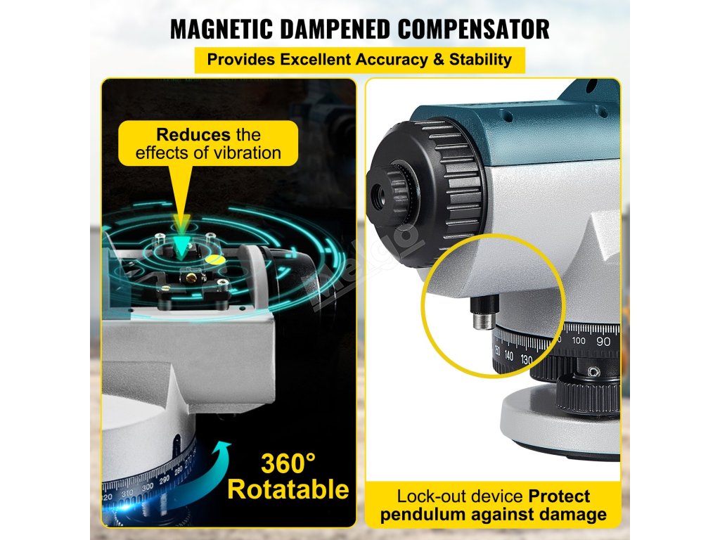 Tato optická vodováha je vybavena samonivelačním magnetickým tlumeným kompenzátorem, který dokáže snížit vliv vibrací; kompenzátor je při přepravě chráněn aretací.