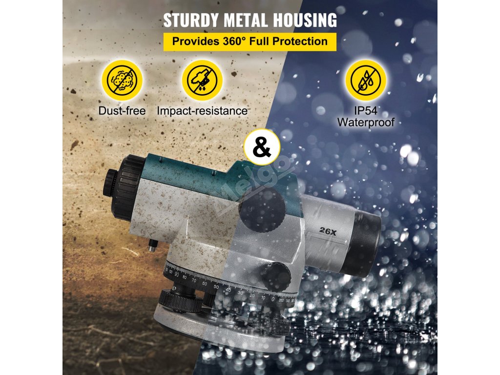Naše automatická optická vodováha je kryta převážně robustním kovem; má krytí IP54, které zajišťuje odolnost proti povětrnostním vlivům, prachu a trvanlivost.