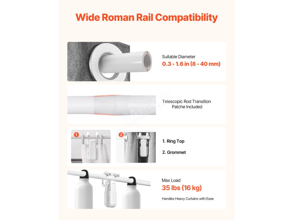 | Kompatibilný priemer rímskej tyče | 0.3 - 1,6 palca (8 - 40 mm) |